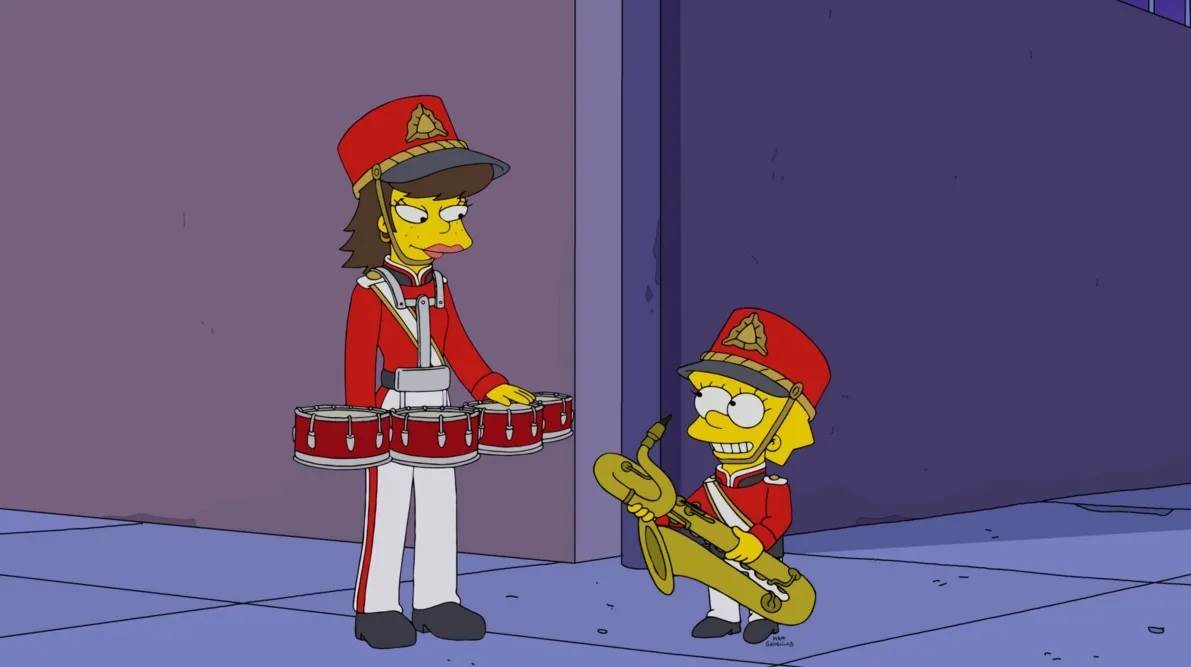 “Girls Just Shauna Have Fun” begins with the Springfield Elementary School band practicing “Mary Had a Little Lamb” with Mr. Largo, who is frustrated by the band’s lack of polish. Principal Skinner enters with a letter from the local high school, which has requested Lisa Simpson to replace an injured saxophone player. The next day, Marge drops Lisa off at the high school and the eight-year-old girl takes a seat with the teenagers. The band leader there has the students play the “Theme from Hawaii Five-O” until interrupted by Superintendent Chalmers’ daughter Shauna (recurring guest star Tress MacNeille), who enters the class late. “I’m going to call you James Corden, because you’re a late late show,” jokes the teacher, and the students appreciate the reference. Lisa reintroduces herself to Shauna, but has to remind her that she babysat for the Simpson children the previous Saturday night.
