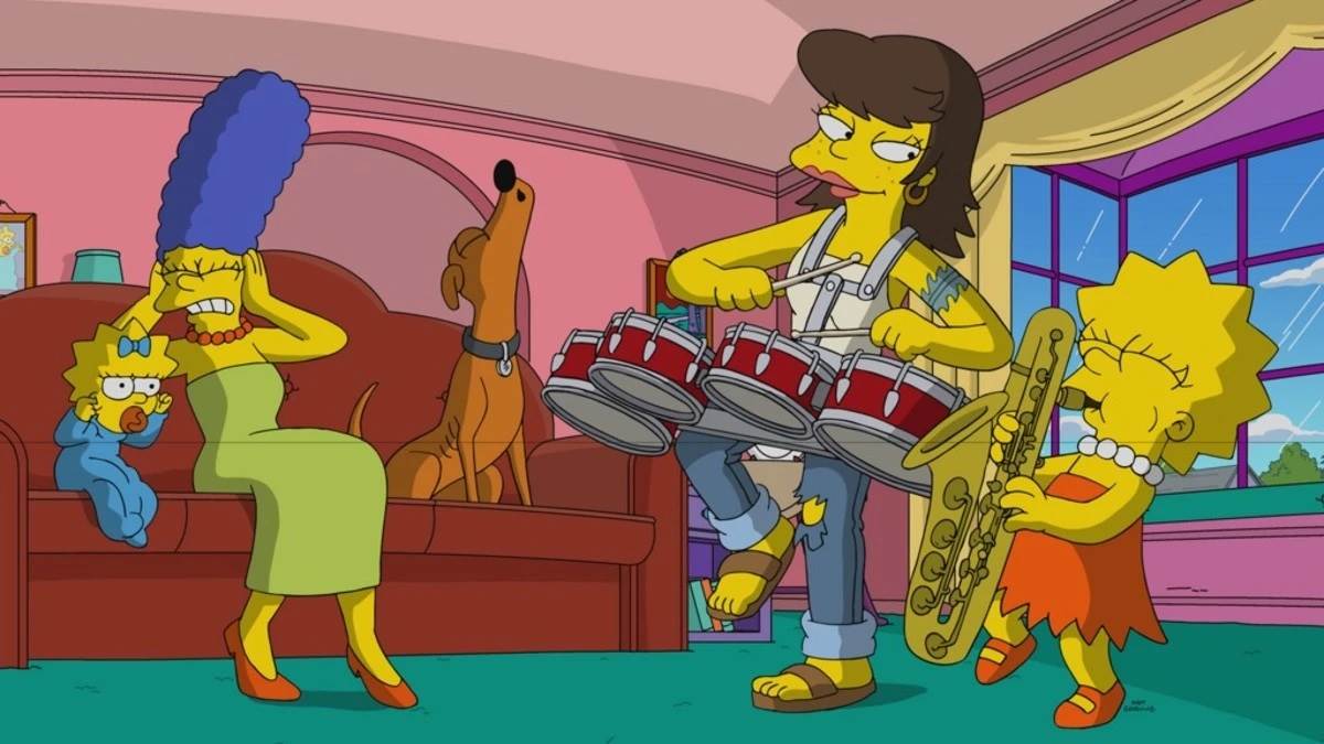 Lisa tells Shauna she should try out for lead drummer, but Shauna isn’t hearing it because she refuses to admit she cares. Lisa talks Shauna into it– “Fine, I’ll do the audition… but only to shut you up.” Lisa celebrates with a sax solo, and later at the audition Shauna wows the teachers and all the other students with her drumming skills. There’s a smash cut to a football game where Lisa and Shauna play in the high school marching band, and afterward Shauna gets asked out by the team’s star quarterback (guest star Chris Redd of Saturday Night Live fame). Lisa gets invited along to a pool party where everyone has to bring a beer to get in, and Shauna says she has a hookup for some brews. At her home, Shauna sweet-talks her father and Homer, distracting them with a demonstration of her musical abilities so she can steal some of their beer. But when the teens come by to scoop up the beers, they sneak into the garage and take all of them instead of just one case.