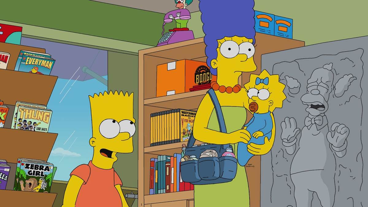 At home, Patty and Selma talk with Marge about how she made the principal’s life a living hell, and we get a flashback to Springfield Middle School, where Marge gets bullied by the other girls. She complains to the principal, who rebuffs her grievances, but then trips and falls into a garbage can. All the kids laugh and give Marge credit for the incident, and then we see a montage of Marge playing further pranks on the principal, encouraged by the rest of the students. In the present, Bart hugs Marge, full of admiration for her childhood hijinks. At the Android’s Dungeon comic book shop, Ralph Wiggum wants to buy “the one where Batman eats lasagna” and Comic Book Guy explains that that is “Garfield, who is not a bat but a cat.” Marge, who is in the shop with Bart, observes the interaction and Bart suggests she should teach CBG a lesson, and a superhero named Uber Hombre (for copyright reasons) eggs her on in her imagination.