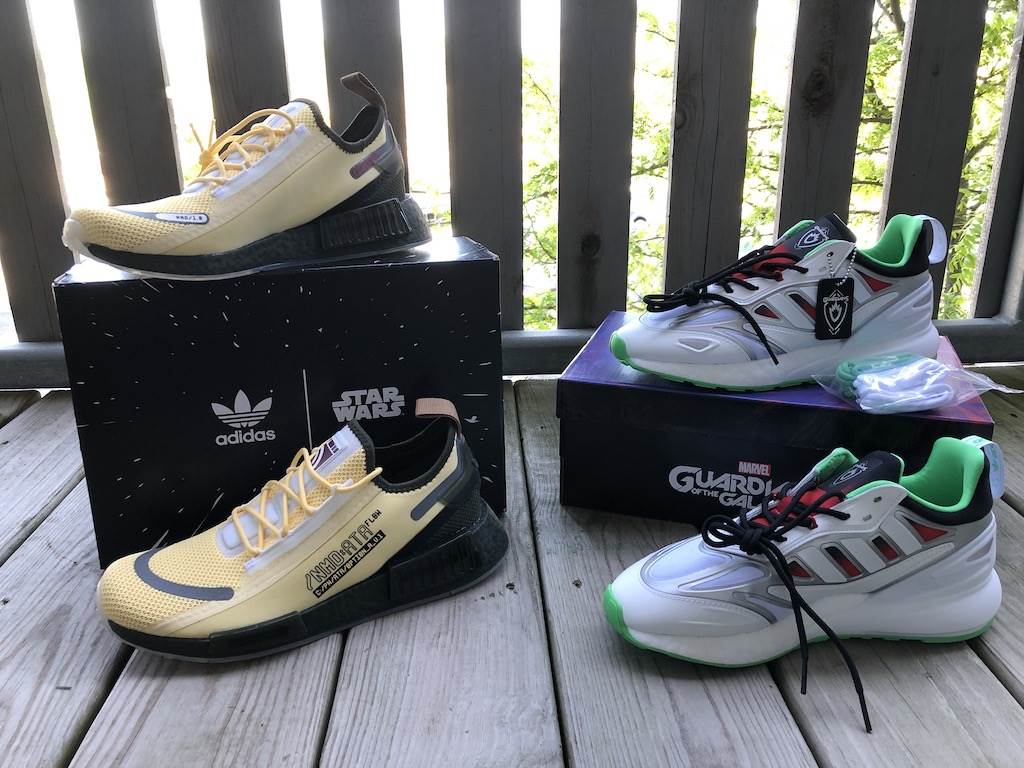 In anticipation of our sneaker post, Adidas sent us two pairs of shoes to check out and we couldn’t believe our luck that we got designs from their Marvel and Star Wars lines! As long time fans of the brand—our go-to running shoes—we were super excited to open the new Guardians of Galaxy Gamora ZX 2K Boost Shoes and Star Wars Bossk NMD_R1 Spectoo Shoes.