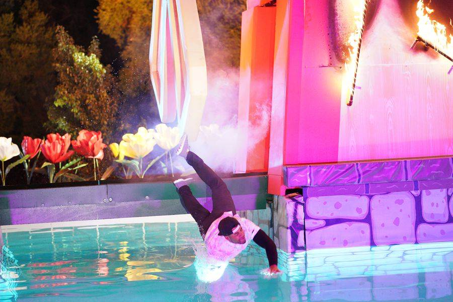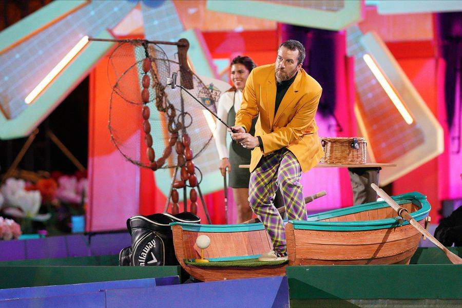 We now head over to PoleCano where Gari and Bob take on the hole. Rob feels that this hole is surrounded by some kind of The Brady Bunch style curse. A reference that’s sure to go over like gangbusters on a show that gets its contestants mostly from TikTok and Instagram. Gari actually launches his ball into the proper channel that will take it to the Tiki position, a prime location for putting once on the green. However, Bob somehow triggers the curse when his ball goes missing in the plinko portion of the hole. Don’t worry though, Course Marshall Joe is on the case. Which means they’re just going to stare at the board until the ball reappears, which it did. Though Bob sticks the landing when he gets blasted into the pole saving himself a stroke penalty, Gari thanks to his advantageous lie takes the win.