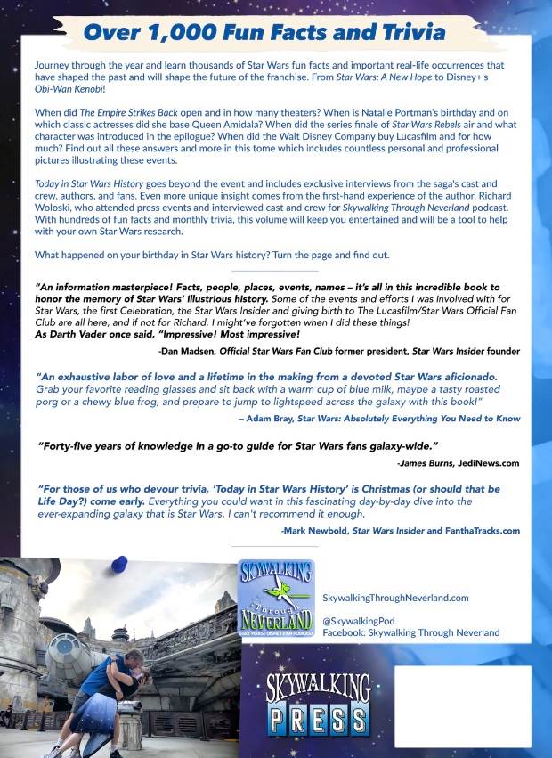 Today In Star Wars History will be released on Wednesday, May 25 (in celebration of the 45th anniversary of the original Star Wars film’s release into theaters– see? I learned something already) but you can pre-order the book right now on Skywalking Through Neverland’s official website.