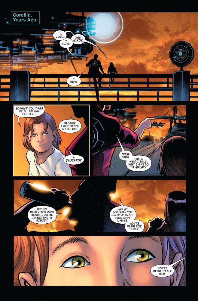 Well it turns out Han had the exact same initial response, because Han Solo & Chewbacca #2 (released today, more than two months later) begins with him slugging the bearded gentleman for attempting to pull a scam on him– but not until after we see a flashback to a young Han’s conversation with his real father while overlooking the Corellian shipyards.