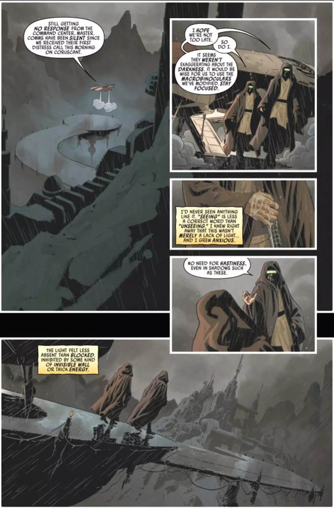 Obi-Wan continues to write in his journal, first thinking back on his recent encounter with Maul in the Tatooine desert (as first seen in the Star Wars Rebels animated series), then reminiscing about a perplexing mission with his old master Qui-Gon Jinn to the Codia System in the galaxy’s Mid Rim. Qui-Gon and young Obi-Wan arrive on Codia’s second moon to find that the celestial body has been bathed in darkness– even their trusty lightsabers seem to be dimmed upon activation. They investigate a mining outpost that had recently been invaded by thieves, the two Jedi unable to see much in front of their own faces without the use of modified macrobinoculars. Inside, they find the power core disabled and numerous blood-covered victims of what appears to be a wolf-like monster running loose in the facility. Upon meeting a Gran survivor from the mining crew, Obi-Wan and Qui-Gon discern that the “monster" is in fact a member of the Defel species (originally spotted as one of the wolfman costumes from the Mos Eisley Cantina in the original Star Wars film) who has been driven mad by the changes in radiation caused by the damaged power core.