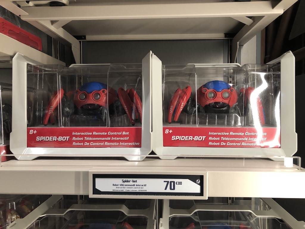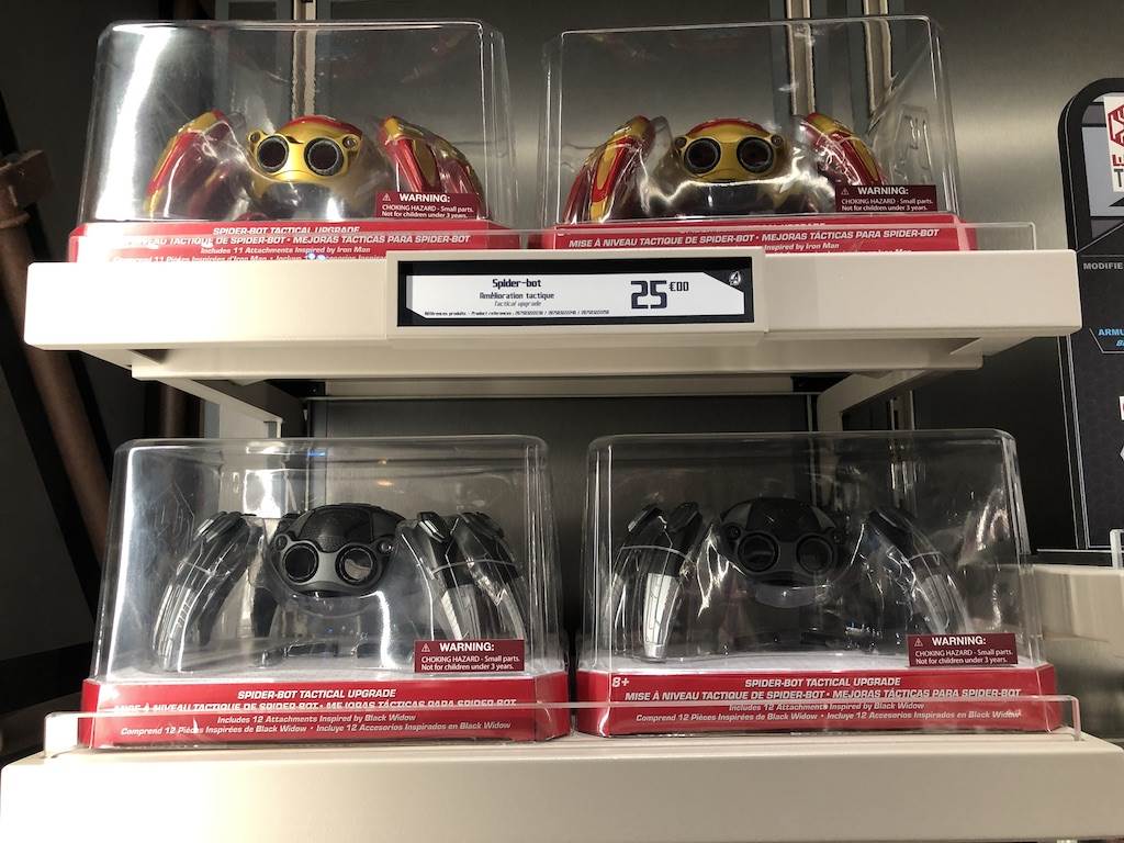 The base Spider-Bot (70,00€) has Spider-Man’s coloring, but these can be enhanced with tactical upgrades (25,00€ each) themed to Black Widow and Iron Man (in California, they also have a brand new Thor upgrade).