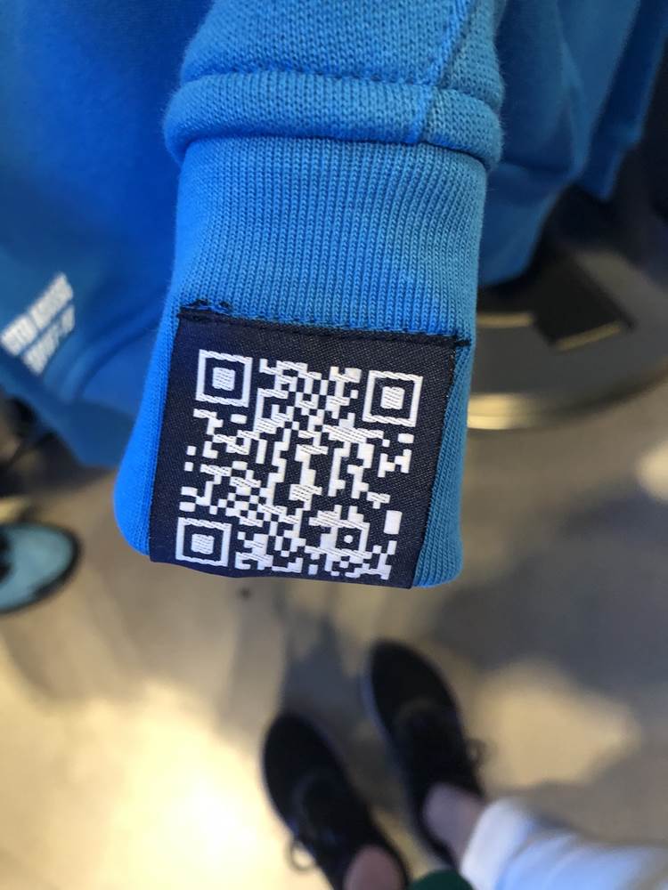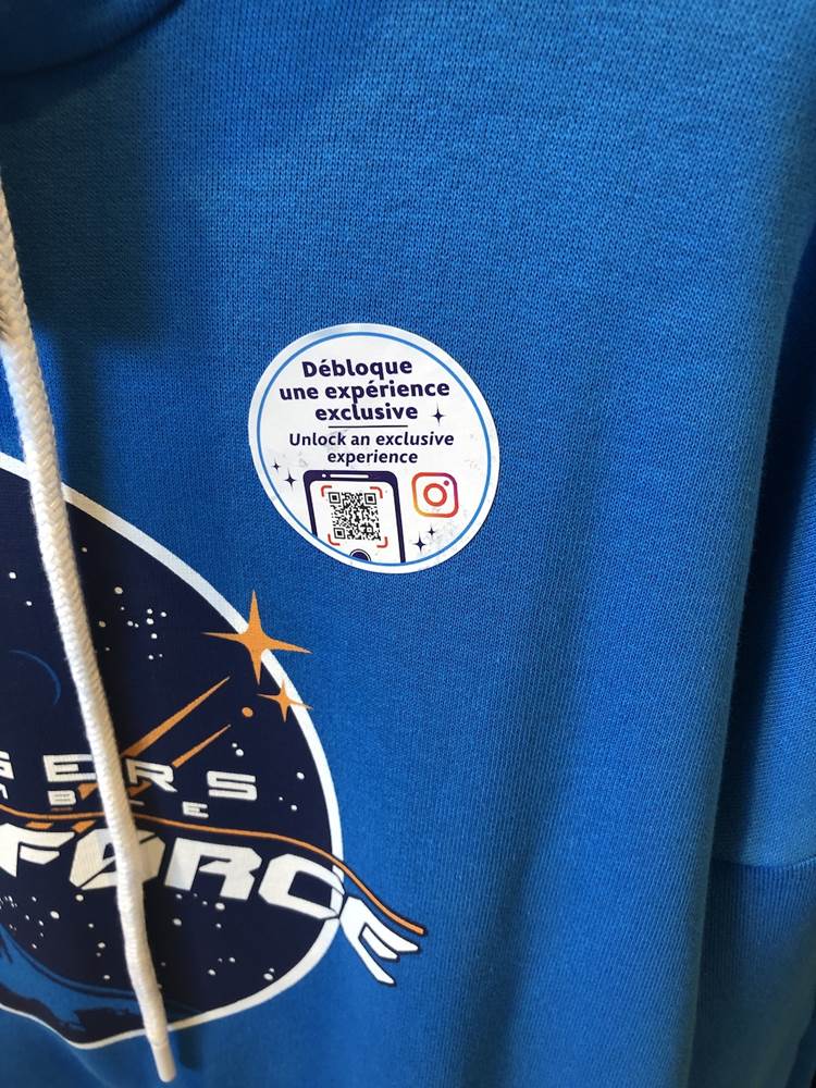 Another offering is a rather large (long) blue hoodie (56,00€) that reads “Avengers Assemble: Flight Force" with a space inspired logo that looks like it belongs at NASA. Interestingly, this shirt also features a sticker directing guests to Instagram via QR code. There’s even a QR code tag on the waistband of the hoodie.