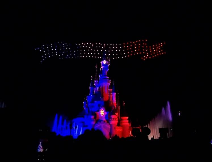 The show lasted 10 minutes and started off with a greeting in English from Lumiere (Beauty and the Beast), inviting us to be their guests for this presentation. The message was repeated in French and then the castle lit up followed by a series of rhythmic fireworks. After a moment, the drones for Disney D-Light started glowing blue, white and red, making a flowing ribbon behind the castle.
