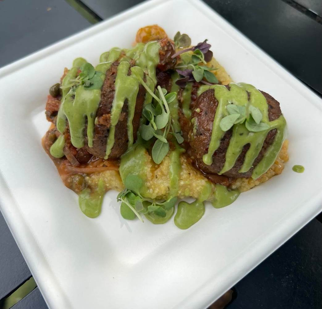 - Impossible Meatball with herbed polenta, rustic puttanesca sauce, and basil pesto $5.75