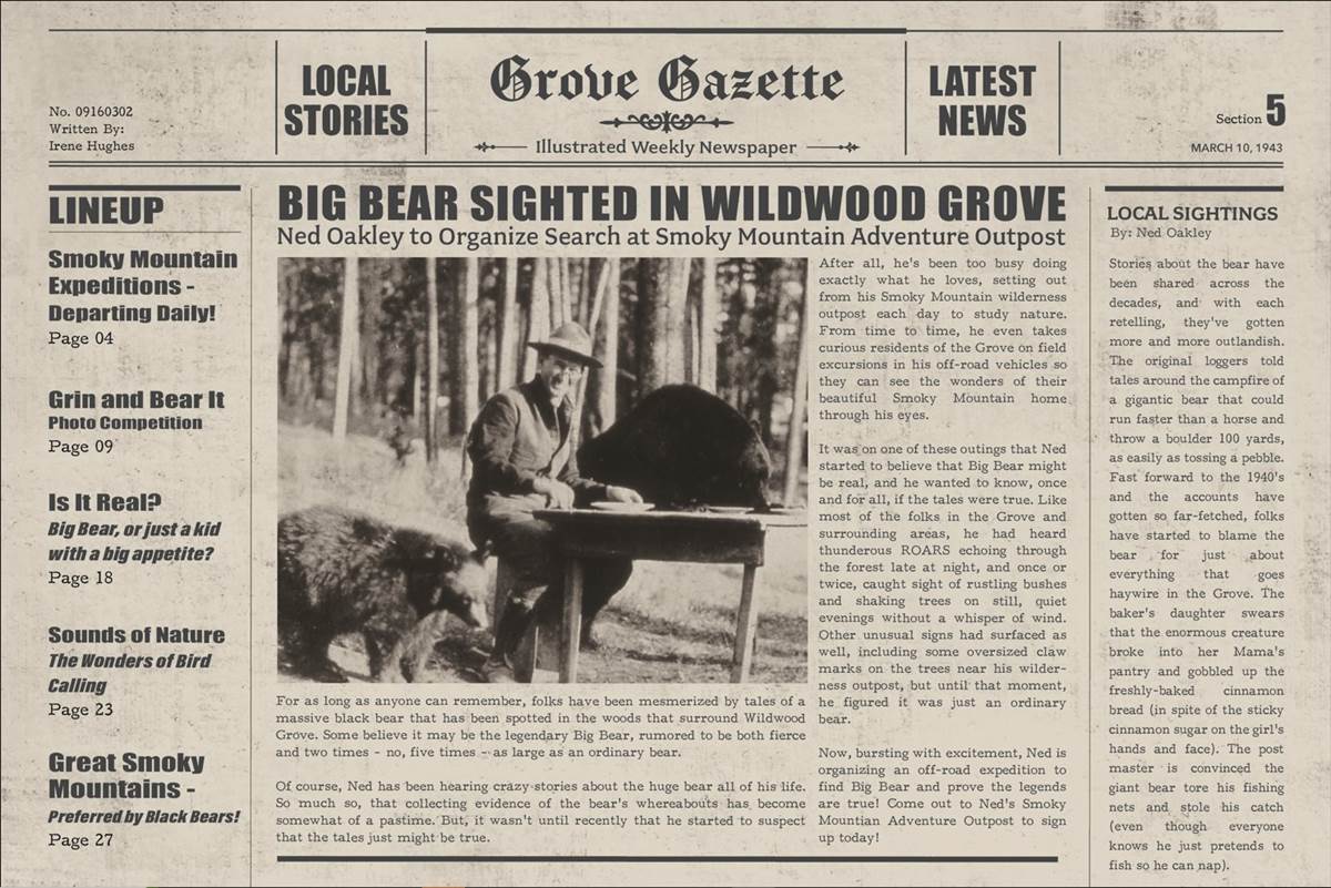 Set in the Wildwood Grove area of the park, the story begins with the legendary sighting of a “Big Bear" from March 10, 1943 (more on that date later). Bear expert Ned Oakley is organizing a search for the massive bear that is “rumored to be both fierce and two times - no, five times - as large as an ordinary bear." Oakley also takes guests on expeditions into the rugged wilderness outside the grove to look for bears, and is starting to think this legend is true. Locals can hear loud roars echoing through the forest, and other evidence has been spotted like footprints and scratch marks, so Oakley is having everyone come out to Ned’s Smoky Mountain Adventure Outpost for an off-road expedition to find Big Bear.