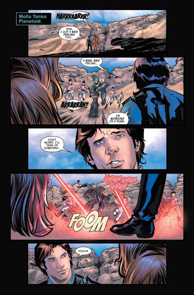 Han Solo & Chewbacca #5 begins where the previous issue left off: with Han and Chewie stranded on the Mollo Tanka Planetoid after Tyra (still posing as Han’s dad Ovan) took off with the Millennium Falcon. Cornered by bounty hunter Black Krrsantan, the title duo find their only means of escape via a rival gang of mercenaries (first seen in issue #1) flying a similar-looking Corellian freighter. Also aboard the ship is Greedo, who Han previously left stranded on Corellia. This crew has also been hired by Jabba the Hutt to retrieve the urn containing the remains of his arch-rival, and our heroes are surprised to find they weren’t the only ones assigned to that particular task. Meanwhile, Marshal Buck Vancto tracks Corbus to Iakar and takes him into custody back to Paqualis III, where the Marshal Service is headquartered. One jailbreak later (thanks to the tracker Han had placed on his “father," since he didn’t really trust him all that much to begin with) and Vancto finds his quarry reclaimed by the mercs. There’s one minor snag to the outcome of this operation, however– in the scramble to escape, Chewbacca gets captured by the Marshals and taken to prison.