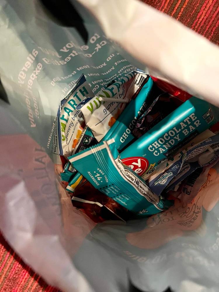 If you have an allergy when you walk in, they will give you an allergy bag. This will let cast members handing out candy know that you are not able to have the regular selection. Instead of candy, they will give you a little token. There were a couple of cast members that did not have the tokens and instead asked me what my allergy was, and when I said dairy, they gave me some Skittles and Starburst.