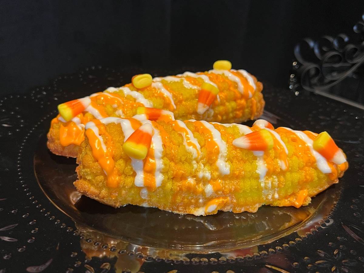 Play a trick on your friends with the “Sweet Almond Corn Cake" at Pecos Bill Tall Tale Inn & Café. It may look like a decorated ear of corn, but it’s actually almond vanilla cake dipped in white, orange, and yellow chocolate topped with candy corn.