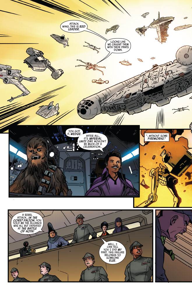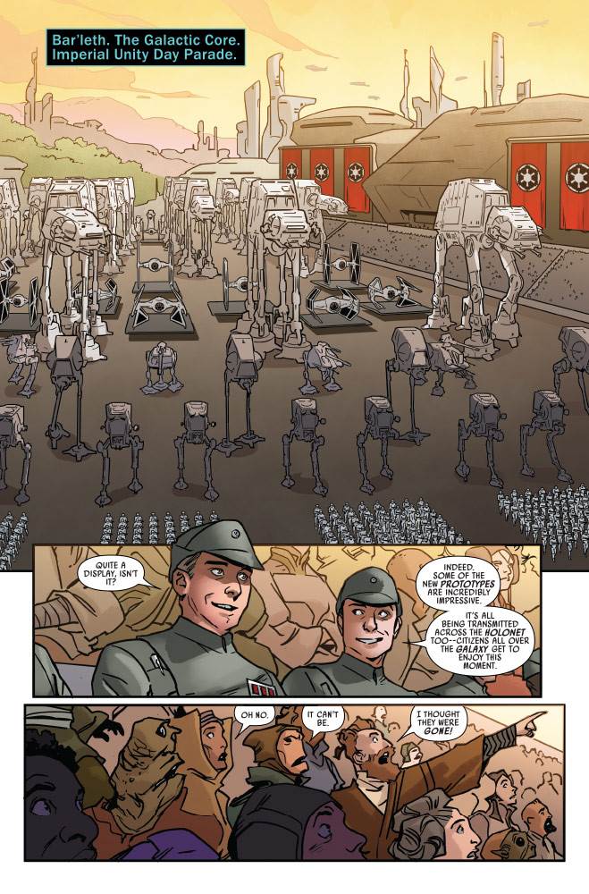 Star Wars #26 begins with an Imperial Unity Day parade on the Core planet of Bar’leth, which is quickly interrupted by a surprise Rebel Alliance attack. After months of running in the wake of the Battle of Hoth, the rebellion desperately needed this victory– and they made sure to do it where the entire galaxy could see, as this event was being broadcast over the holonet.