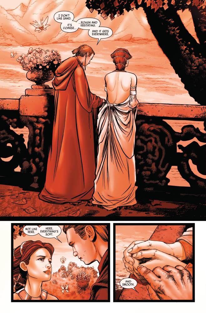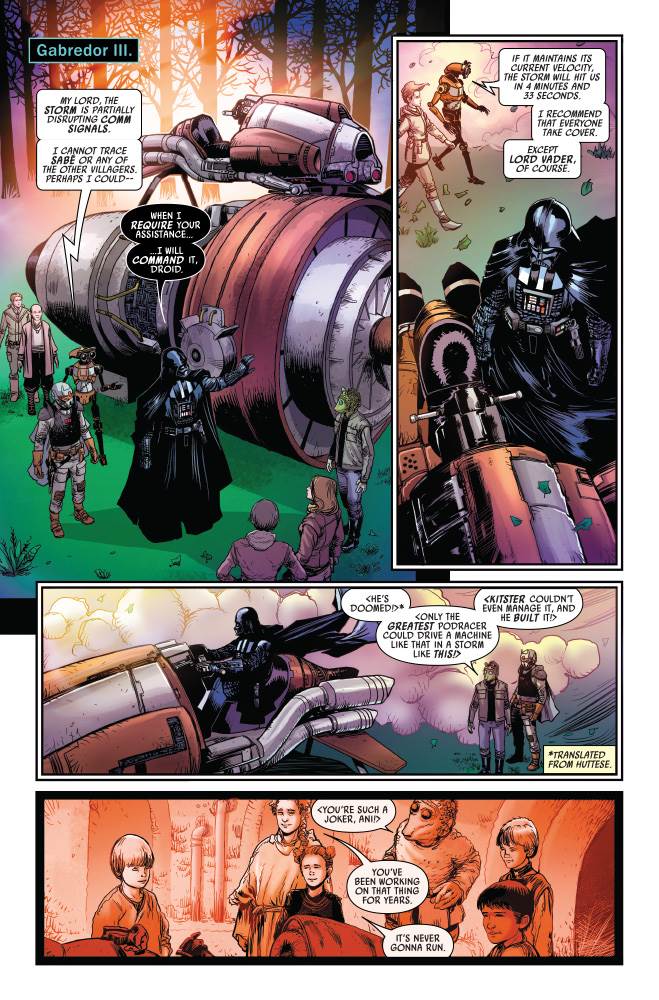 Issue #20 of Star Wars: Darth Vader’s third volume begins on the planet Gabredor III, where Vader has accompanied Padmé Amidala’s former handmaiden Sabé to help a colony of former slaves. Among this group are Wald and Kitster, Anakin’s childhood friends, the latter of whom has constructed his own podracer on this planet far from Tatooine. And Wald warns Vader that the machine is far too dangerous to drive in a raging sandstorm (see the previous issue), but the Sith Lord Formerly Known As Anakin Skywalker knows his own skills behind the yokes of a podracer. He steers the vehicle out into the desert to where Sabé is trapped, flashing back to relevant scenes from the prequel trilogy the entire way. We see Anakin and Padmé having that infamous conversation on Naboo, we see a much younger Anakin firing up his personal podracer engine in Mos Espa, and we see a new flashback to a sandstorm in which Annie refuses to leave his mother Shmi behind. There’s also a similarly red-tinted look at the pivotal scene in the Jedi Council chamber on Coruscant from Star Wars: Episode I - The Phantom Menace, in which Master Yoda tells young Anakin he is afraid to lose his mother.