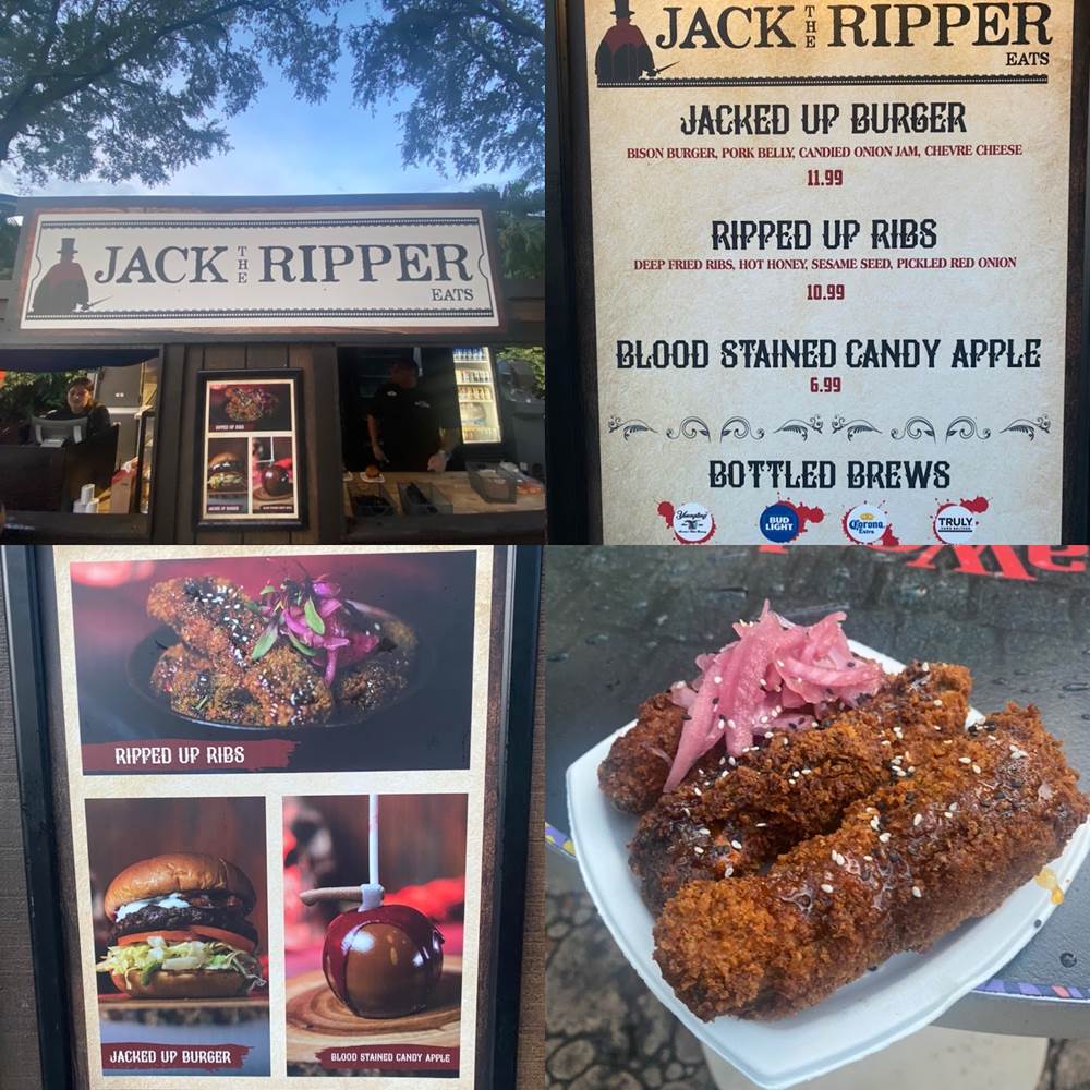 As for the food, it’s interesting. There is Crawling Cravings, a quick service restaurant that features actual insects in all of their offerings, such as the Chipotle Cricket Sandwich: a crispy chicken sandwich with dehydrated crickets. Or there’s the Ant Pretzel Rod, a crunchy pretzel dipped in white chocolate and topped with ants. Then there is Jack the Ripper Eats featuring a burger, candy apple and the stand-out item Ripped Up Ribs. Deep-fried ribs topped with pickled red onions, it was delicious! Don’t forget if you get thirsty there are five themed bars throughout the event area with lots to see and even more to drink.