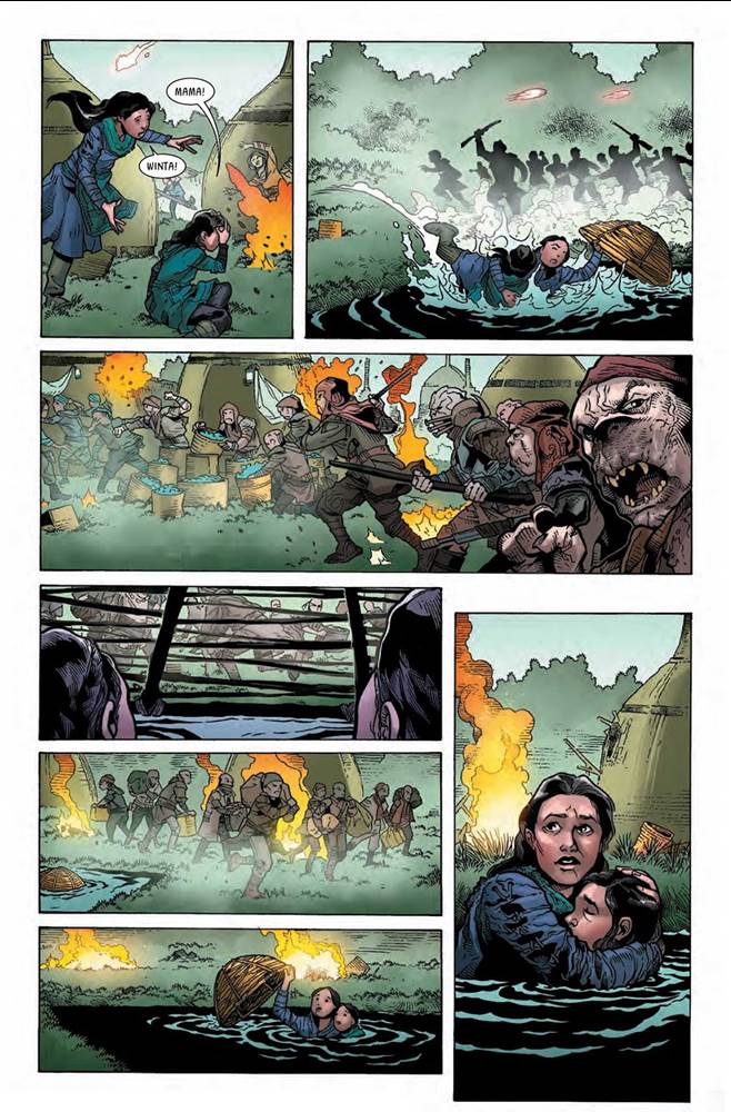 The answer, as I probably should have guessed, is that the comic book (being a fairly straightforward adaptation of The Mandalorian TV series, as always) doesn’t really address the debate at all, nor does it make a big deal either way about Cara Dune’s presence in issue #4. Even the likenesses of the character, which both often resembles Gina Carano and also occasionally sort of doesn’t, is pretty noncommittal either way. The whole thing is presented very matter-of-factly, which ultimately was probably the smartest choice about how to handle this aspect of the comic. For those who may not recall, “Sanctuary" is the episode where the title character and his new companion (known only as The Child by this point) end up on Sorgan to slip away from the fuss caused by their narrow escape from Nevarro. They meet Cara Dune, a former rebel shock trooper, in an alehouse, then team up with her to protect a small village from raider attacks, bringing down an ex-Imperial AT-ST walker in the process. The episode was itself inspired by the Akira Kurosawa film The Seven Samurai, which has been adapted via A Galaxy Far, Far Away several times over at this point (in the original Marvel Comics Star Wars run and The Clone Wars animated series), which is why it feels so familiar.