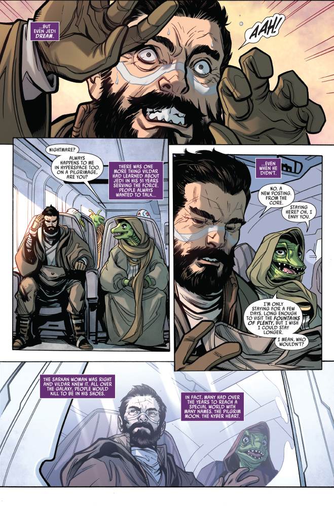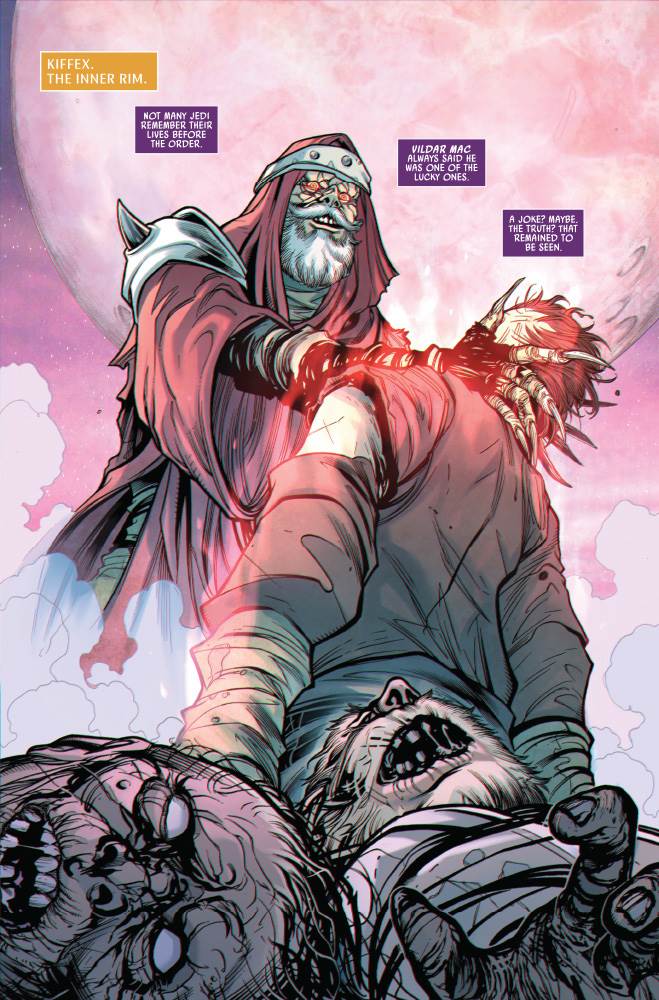 The High Republic’s second phase is set 150 years before its first, and that means writer Cavan Scott has again been tasked with introducing another entirely new cast of characters for this comic. The great news is that Scott– as always– does a terrific job of this, starting us off with flashbacks to Jedi Vildar Mac’s youth and a showdown with a member of the dark-side sect known as the Sorcerers of Tund. We then flash to the “present" of this title, where Vildar is still haunted by the PTSD of that incident. Mac arrives on Jedha, where he meets a young Padawan named Matthea Cathley (she goes by Matty) who shows him around the city. Here we get a taste of the conflict between the various religious faiths on the Pilgrim Moon, and it’s instantly rewarding to get so much information about the many ways people interpret the Force in this period of the galaxy. Some of this information has been out there already, of course, but I love seeing it spelled out in this way and getting to spend time with members of each denomination. There’s an altercation in the streets after a so-called “Truthsayer of Bpfassh" is called out for being a supposed charlatan during his stage show, which culminates in Vildar chasing an opportunistic pickpocket off down the city’s winding alleyways.
