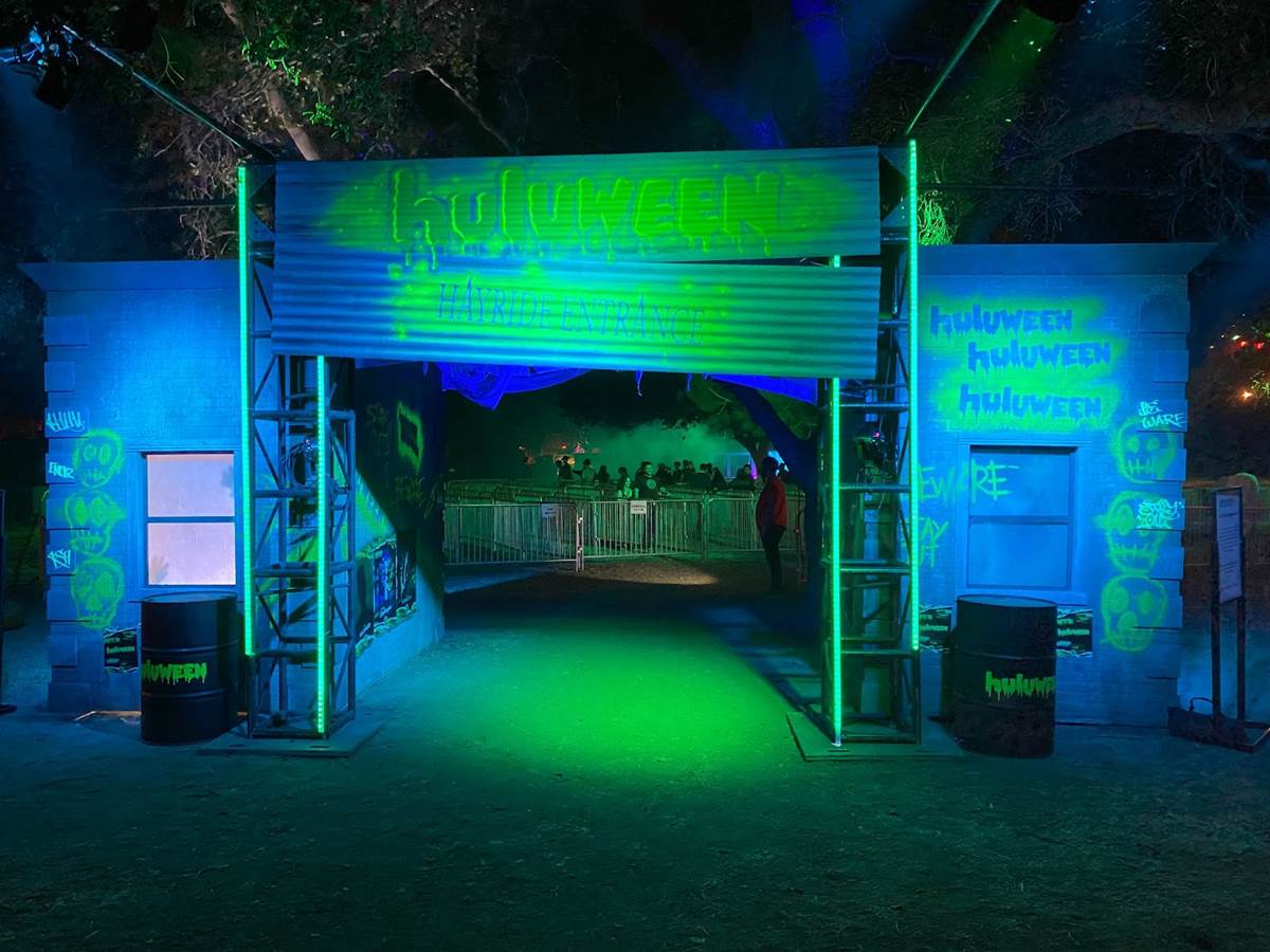 When it’s time to move on to the main event, guests will enter through a Huluween waystation decorated with posters for Hulu’s original Halloween programming like Hellraiser, Grimcutty, and Huluween Dragstravaganza. Then the entrance to the Haunted Hayride itself is made to look like an eerie abandoned gas station.