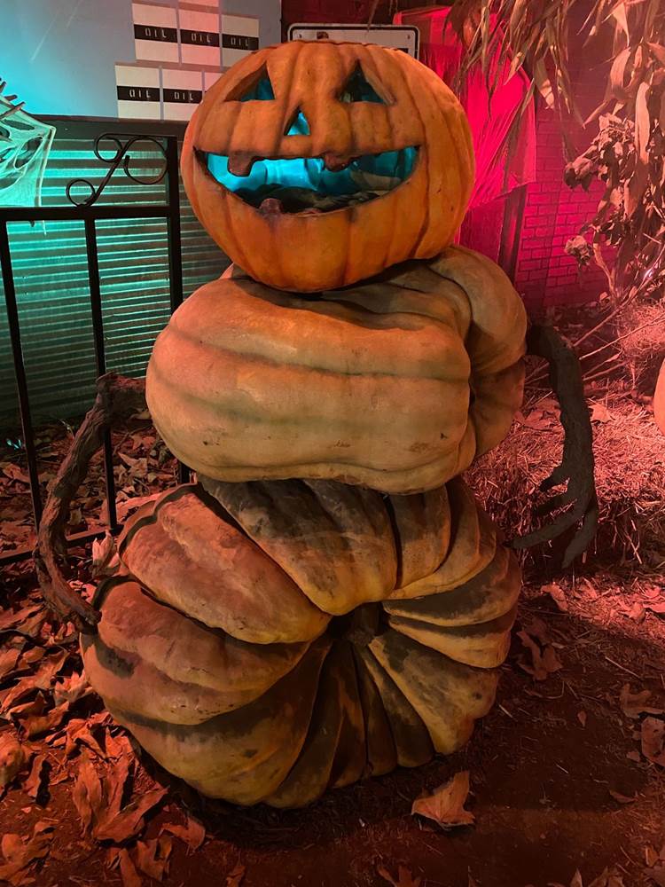 Next to the Haunted Hayride is another area decorated with a very cool tower of jack o’lanterns (perfect for photos) and another sponsored Huluween experience, this one a video opportunity housed within a tiny shack. There’s also a ghostly merry-go-round populated by creepy skeleton horses, though sadly it’s not actually rideable.