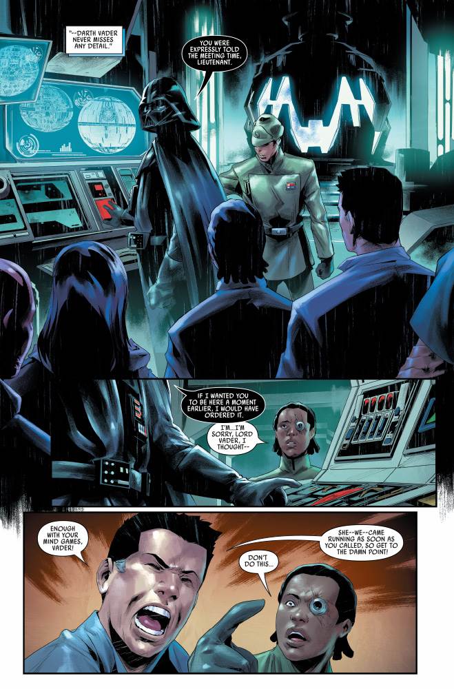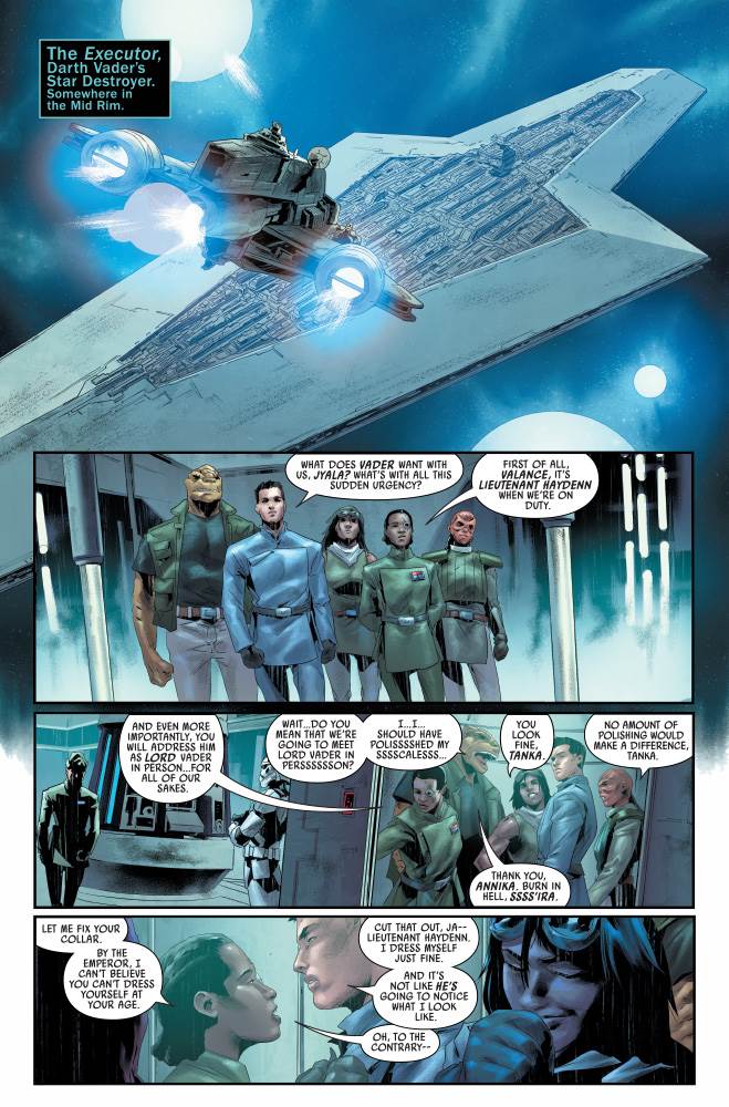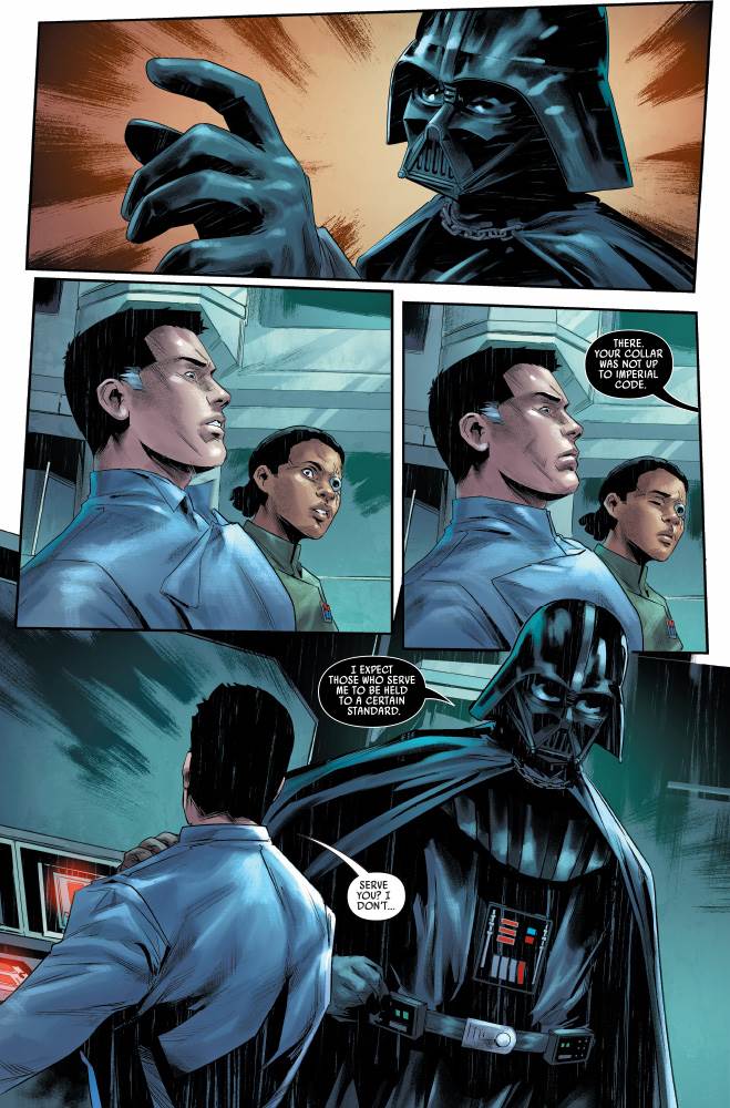 Then, in an effort to help his friends, the droid bounty hunter 4-LOM sabotages the only safeguard that prevents the station from crashing into said black hole, which forces T’onga, Losha, Tasu Leech, Bossk, and Zuckuss to scramble for safety. Some of the interactions between Zuckuss and 4-LOM are intentionally hilarious, and I’m digging the interplay between all these characters. Meanwhile aboard Darth Vader’s star destroyer Executor, the hesitant Imperial collaborator Beilert Valance is set to be commended by the Dark Lord for his recent work rooting out Crimson Dawn traitors among the Imperial ranks. There’s another funny, completely out-of-left-field moment where Vader uses the Force to fix Valance’s errant collar (we’re meant to think he’s going to choke him for his insolence) to bring it up to Imperial standards, and I can’t help but imagine that Sacks is having quite a bit of fun writing this comic these days. Plus the deposed General Vukorah returns to Corellia to reclaim her title as the leader of the Unbroken Clan, though she seems to have some regrets about her recent actions in getting back– or that’s how I interpreted it, anyway.