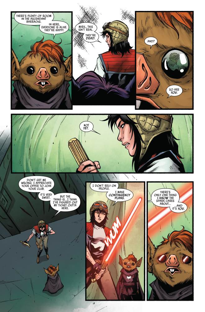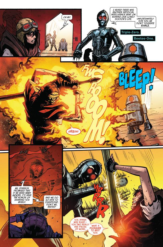 Thankfully, a team of Aphra’s exes and frenemies has shown up on Crimson Dawn’s flagship the Vermillion to try and snap her out of the psychic prison, but that means having to enter into combat with the Spark Eternal, which is more than willing to employ some dirty tricks in battle. For instance, the Spark uses its ingrained technology to take control of Kho Phon Farrus’s magnetic Ascendant “calling gloves," and turns them against the others. Meanwhile within her own brain, Chelli begins to concoct her own plan of escape, which is aided by the sudden appearance of Magna Tolvan, who uses her matching electro-tattoos to hack into the Spark’s mainframe and speak to Aphra. Back on the ship, the malevolent droids Triple-Zero and BT-1 take on the Spark Eternal, only to be skewered by the Null Blade and forced to do the AI’s bidding. At the climax, the Spark whispers something inaudible to the others and the reader into Kho’s ear, which suddenly turns the wannabe-Sith to its side. Then the AI escapes aboard Aphra’s ship the Ark Angel with the two now-obedient murder droids, blowing up Sana Starros’s pursuing vessel the Volt Cobra in the process.