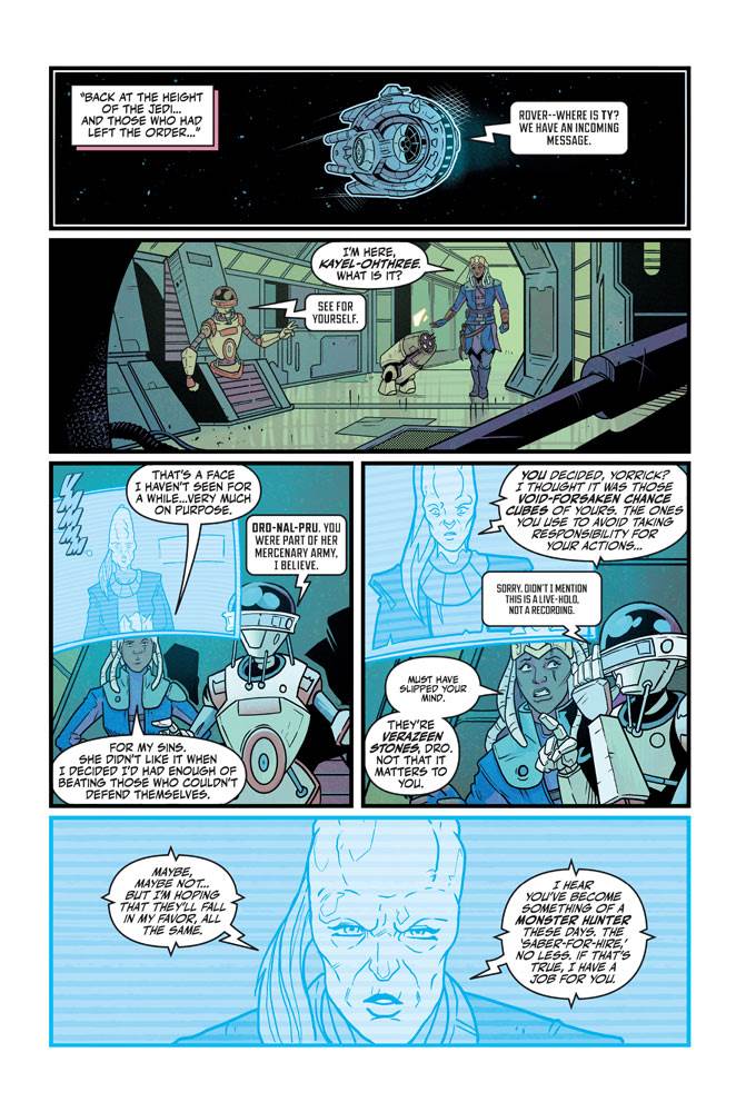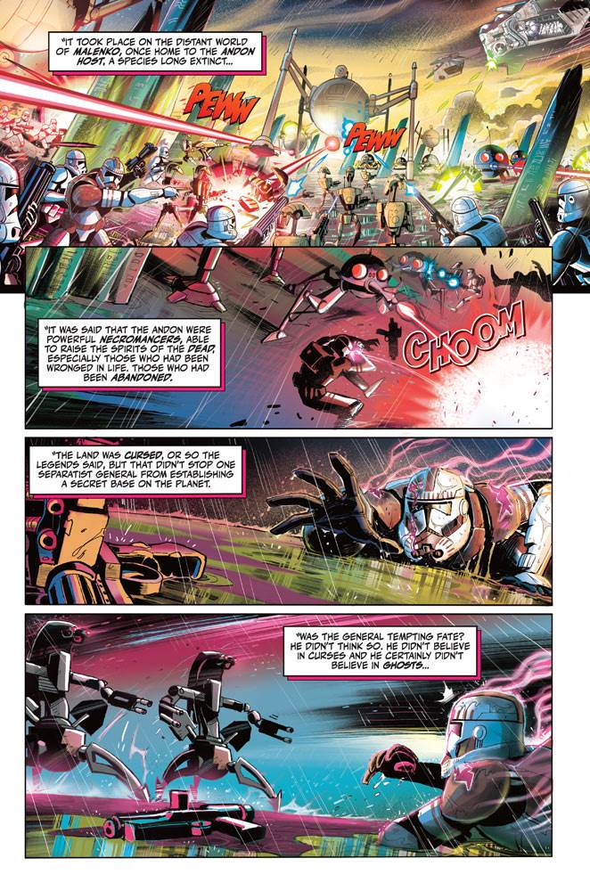 Tales from the Rancor Pit is a hard-bound edition that is longer in page count than the average comic book, but smaller in area, if that makes sense (the width is about 6.25 inches, while a standard comic is around 6.75). It contains three stories overall with a bookend framing story that involves a Harassian smuggler named Captain Vaclav, who is imprisoned by Jabba the Hutt in the period between the events of The Empire Strikes Back and Return of the Jedi– we know this because Han Solo’s carbonite-frozen body is depicted hanging on Jabba’s wall. Jabba has Vaclav dangling over the titular Rancor Pit, but the captain offers the mighty Hutt stories in exchange for his life. The first flashback tale involves ghost droids during the Clone Wars (this story much more inventive and clever than I’m making it sound), the second stars monster hunter Ty Yorrick on a mission during the High Republic era, and the third zooms in on the familiar Echo Base, which is plagued by creatures as the Rebellion establishes a headquarters on Hoth. All of these stories are entertaining, but my favorite was probably the first one, mostly because it feels so imaginative, playful, and delightfully outside-the-box for this franchise.