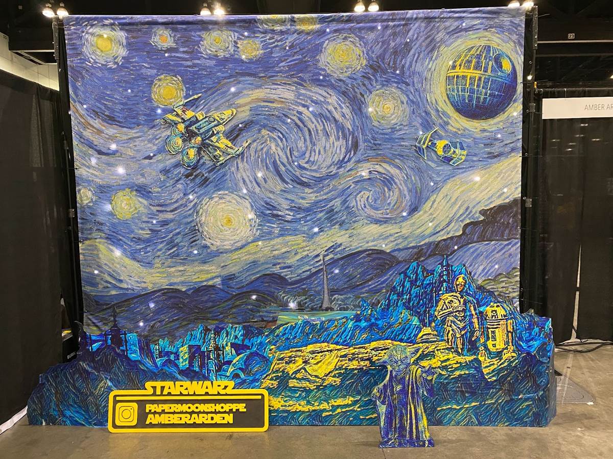 I arrived at the Los Angeles Convention Center at 9:30 AM, which was the scheduled opening time for L.A. Comic Con, and found attendees already gathering in the building’s massive lobby. There were statues of Captain America and Ant-Man being used as a backdrop for video broadcasts, signs advertising a giveaway of a life-size Grogu statue from The Mandalorian, and even a photo op depicting Vincent Van Gogh’s famous painting “Starry Night" as something out of the Star Wars galaxy.