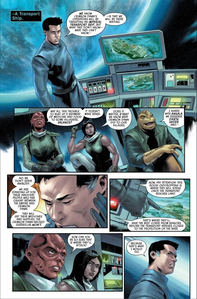 After IG-88 completes his task, we see the next bounty he’s assigned to track down for the Empire: General Vukorah of the Unbroken Clan, who doesn’t appear in this issue otherwise. Then we cut back to Bestine, where Tasu Leech and Bossk are ambushed by Tanka (a member of the so-called “Revengers," a team assembled by the Empire to take on Crimson Dawn in the Star Wars: Darth Vader title), and it’s a thrill to watch the two reptilian Trandoshans on warring sides go mano-a-mano after Tasu is taken out of commission during the fight. And after a half-dozen pages of fisticuffs, Bossk emerges victorious by using his wits to outmaneuver Tanka’s obviously superior strength. But the bounty hunters haven’t accomplished their goal quite yet, as T’onga, Losha, and Zuckuss find themselves pinned down by Imperial forces, and then– in a cliffhanger reveal– discover their enemy is being led by none other than Valance himself. It’s an extraordinarily exciting issue overall, and I dare say it may rank among my favorite chapters of the Bounty Hunters comic, mostly thanks to the well-choreographed action and compelling variety of characters and locations. My only hope is that writer Ethan Sacks and his artistic cohorts can keep up the quality as the palpable dramatic tension between factions rises. To whose allegiance will Valance remain faithful: his freelance friends or the Empire and Vader? We’ll find out next year.