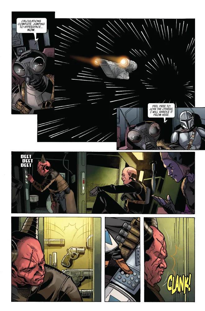 Here’s where things get iffy for me in the comic-book version of the story: on Disney+, the climax of this episode is perfectly edited, with Mando almost acting as a Batman or Xenomorph-from-Alien type threat to the gang of criminals, taking out one at a time as they wander helplessly around the corridors of the ship. But in the comic, that entire sequence comes across as rushed, as though Barnes and Jeanty ran out of space. It’s funny, because I had been wondering what the process was of spacing out the scenes and beats of a series that consists of episodes of varying length when translating it to the comic page. I suppose the answer is that sometimes the comic creators must sacrifice the effectiveness and pace of certain sequences in order to make room for others in the same issue. It’s a shame because, with just a few additional pages I think this would be a near-perfect adaptation, but as it stands there are moments I loved in live-action that just plain fall flat here. But I also understand that, unlike the series’ episodes, each issue must be confined to a certain page count, and compression must be made in some areas along the way. Still, disappointment about those sacrifices aside, I still believe that this team is doing a mostly bang-up job bringing The Mandalorian to another medium, and I’m looking forward to finding out how they pull off season one’s final two episodes.
