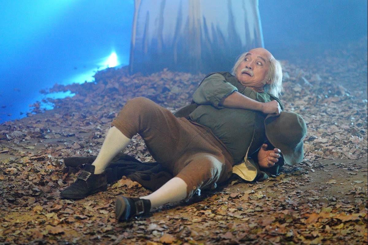 The special condences the animated segments in between songs, in some instances swapping them out with moments of interpretive dance. Jon Jon Briones plays Belle’s father Maurice (a non-singing part) in several scenes, including facing off against performers dressed as wolves, which feels like the Mouse King battle from The Nutcracker. Dancers also become the enchanted rose, filmed from above like a Busby Berkeley musical number, separating to become falling petals. The moment Belle rescues her father has also been acted out, which comes with the reveal of Josh Groban in a Beast costume, which looks like a cross between a walkaround puppet from Where the Wild Things Are and a Gundam mecha. Groban’s face is visible through the rib cage during “Something There," although he thankfully ditches the suit when performing “Evermore.