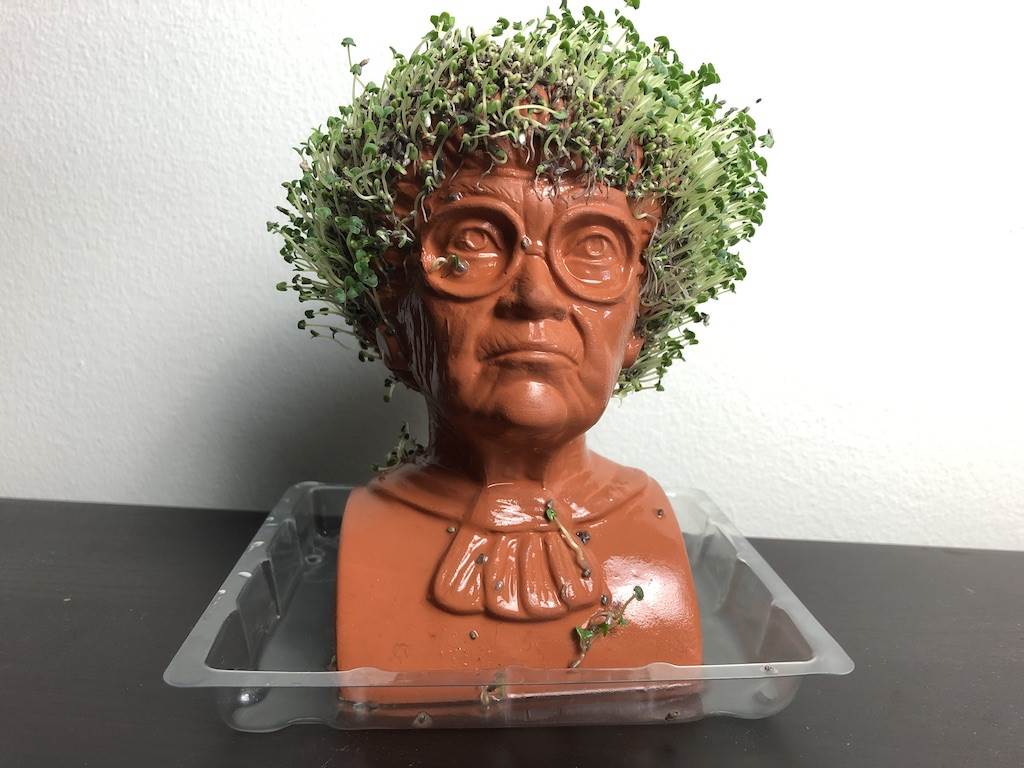 It’s been 10 days and Sophia’s “hair" is growing in! Some of the seeds at the back have fallen off so she won’t have a full head of green sprouts, but otherwise, she’s looking good. I’ll also note that the instructions recommended spritzing the seeds with water daily or covering the bust with a plastic bag so it wouldn’t dry out until the growth began. I must have trapped too much moisture in the bag as some seeds became a little moldy. Whoops.