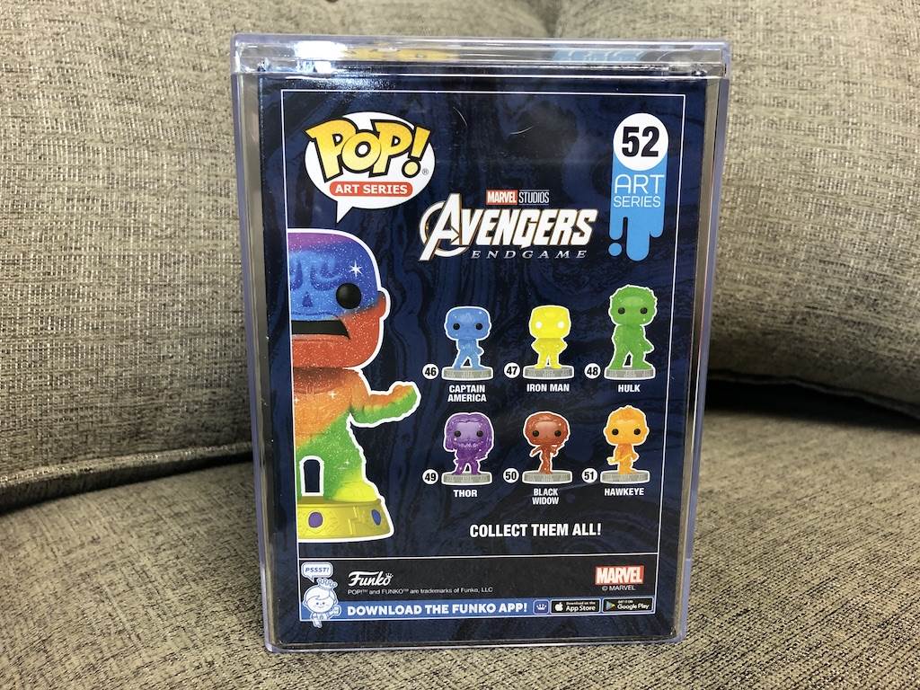 Unlike the heroes of the wave who stand on grey platforms, Thanos dominates the scene on a golden dais surrounded by the Infinity Stones. He comes packaged in a blue Art Series box which includes hard plastic Pop! display case that comfortably holds the boxed figure.