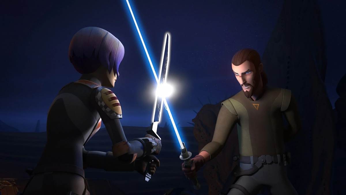 Episode 52: “Trials of the Darksaber" – Fenn Rau (Kevin McKidd) visits the Ghost, and Kanan tells the Mandalorian warrior about Sabine having found the Darksaber in Maul’s hideout on Dathomir. Together they decide that Sabine should wield the weapon in an effort to unite her clan in the battle against the Empire, but she is hesitant to accept that responsibility. But Sabine reluctantly agrees to be trained by Kanan in saber fighting, though he will only allow her to use wooden training sabers at first. When the training hits a frustrating impasse, Hera convinces Kanan to let Sabine learn how to use the Darksaber on her own terms.