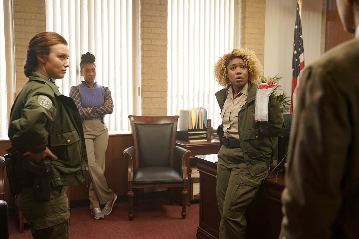 Randy’s wife Irene (Amy Parrish) cries in Josie’s office as they ask if her husband had any enemies. She doesn’t think so, but she recalls an unusual moment a few weeks ago. A toy car was left on their porch, an orange station wagon. It seemed like such an innocent thing, but Randy was very upset about it. After Irene leaves, Deputy Riley (Avery Bigelow) enters with an evidence bag. She overheard and wanted to show Josie that a car just like it was found on the dead body of a hunter named Kramer. All of this jogs Amanda’s memory and she pulls up information from decades ago, a Black family murdered in an orange station wagon on July 4th. The sheriff at the time didn’t do much investigating. Sheriff Millie says she had never even heard of the event, adding that she recently moved to the area.