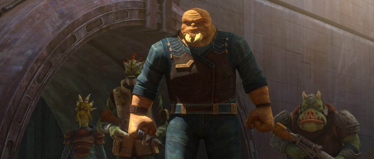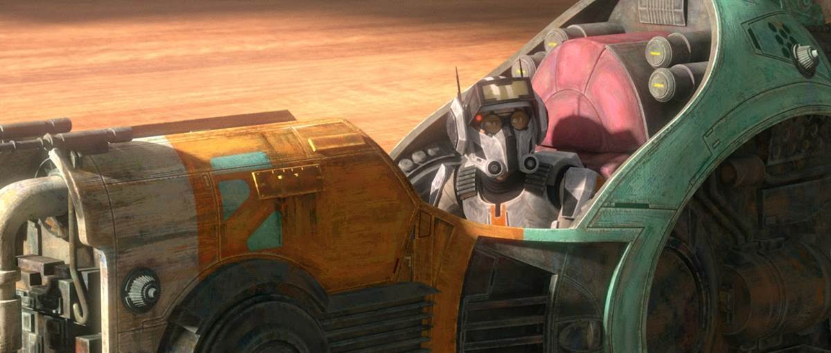 “Faster" begins on Ord Mantell, where Cid (voiced by Rhea Perlman) has a new task for Clone Force 99, or a few members of the team, anyway. She has Omega (Michelle Ang), Tech, and Wrecker (all the male clones are voiced by Dee Bradley Baker) accompany her to the planet Safa Toma, which can be “a little rough around the edges"-- hence the need for Wrecker as security. There, Cid introduces our heroes to Riot Racing, which is similar to Pod Racing except for the lack of external engines and the fact that a good number of the pilots are droids. After Cid’s racer TAY-0 (guest star Ben Schwartz from Parks and Recreation, doing his best sassy droid voice) wins and we get to know his boisterous personality, Cid– or Ciddarin Scaleback, as is apparently the Trandoshan cantina owner’s full name– is confronted by local Dowutin heavy Grini Millegi (Ernie Hudson of Ghostbusters fame) and his Riot Racing “champ" Jet Venim (Jonathan Lipow from Doom Patrol). Cid and Grini make a side wager on an upcoming race, and then Millegi rigs the outcome so that Venim comes in first, kidnapping Cid until her cohorts are able to pay what she owes. And when TAY-0 proves himself more accident prone than we were first led to believe, Tech must step up as the pilot of Cid’s speeder.