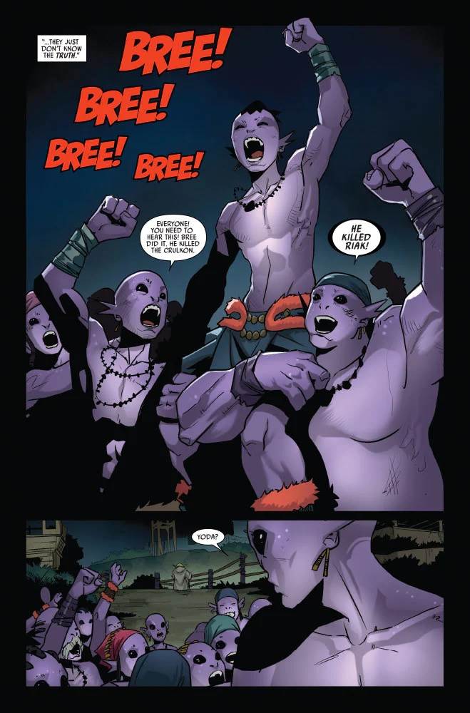 Now, in issue #3 of the comic miniseries (released last Wednesday), Yoda has seemingly abandoned the Scalvi community after one of its adolescent members murdered a Crulkon raider in cold blood.