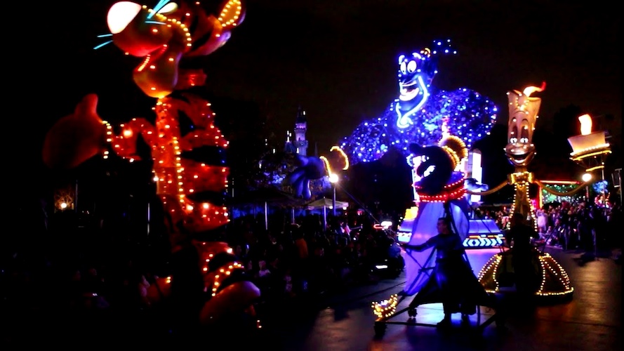 The 15ish-minute show would lead the crowd in two songs, one of which might have been a bit familiar to long-time Disneyland fans as the music from Party Gras, the park’s 35th anniversary celebration. Though, the lyrics have been changed from “Party Gras" to “Carnivale." The real highlight though were the towering, glowing puppets of favorite characters who lead their appropriate color sections. Mike Wazowski for Green, Tigger for Orange, Sebastian for Red, Genie for Blue, and Lumiere for Yellow.