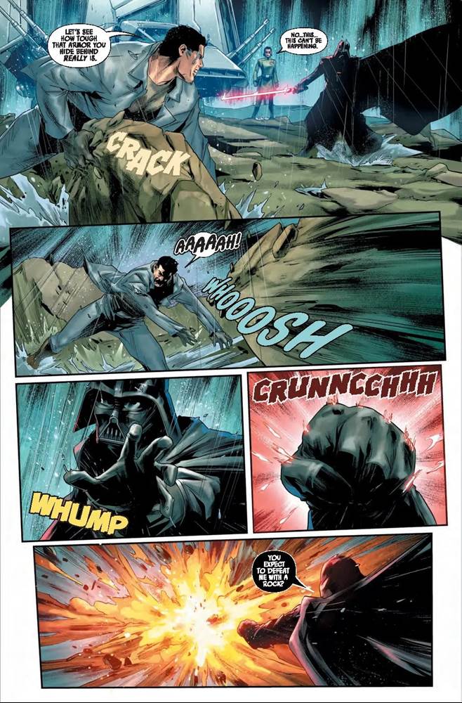 Bounty Hunters #31 begins on the planet Bestine IV, where– in picking up just after the cliffhanger ending of the previous issue– Valance is already face-to-face with Vader on the battlefield, as his friends look on helplessly from the background. And despite the cyborg bounty hunter not having any dark Force powers like his opponent, his robotic enhancements do help make him a fairly even match for the Dark Lord. There’s a back-and-forth for a few pages until T’onga tries to intervene on a speeder bike and immediately gets cut down by Vader, who has finally ignited his lightsaber, thus finally giving him the upper hand in the battle. From there, Vader reveals that he has ordered a TIE bombardment of the village Valance was trying to protect, and where the Imperial team he had been leading was hiding out. This pushes Beilert even further into a fit of rage, but Vader only forces his subordinate Jyala Haydenn– with whom Valance had been developing a relationship– to eliminate his enemy.