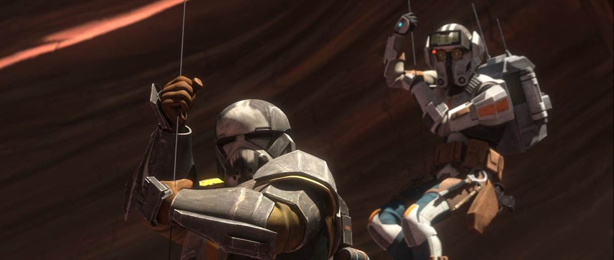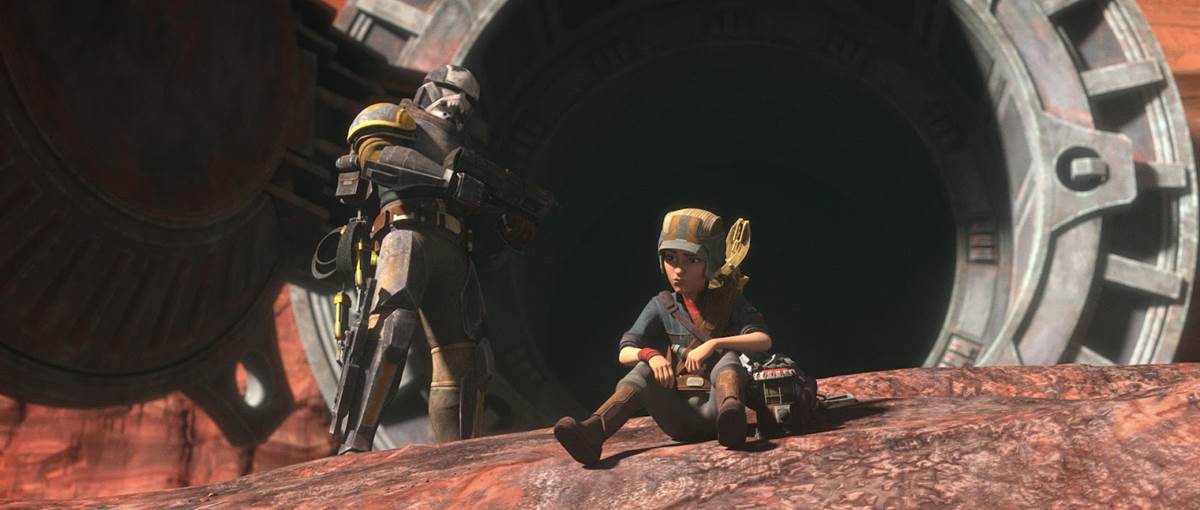 “The Crossing" begins on an unnamed planet where Cid has evidently purchased an abandoned mine and sent the Bad Batch to recover its last remaining deposits of a highly explosive mineral called Ipsium– think Rhydonium from other Star Wars media, but… y’know… with a different name. Anyway, Hunter and Tech set about exploring the mine for Ipsium while Wrecker and Omega (Michelle Ang) stand guard outside. They kind of fail at that job pretty spectacularly when a thief makes off with the team’s ship the Havoc Marauder, but Omega makes up for it with her skill at extracting the volatile mineral. But since the ship is gone, the team has to hoof it through a series of chasms to a nearby outpost that Tech had made note of on approach to the planet. Along the way, they have to deal with a stampede of local fauna and an ensuing sandstorm that causes Tech to lose track of their container of Ipsium, which then explodes and traps our heroes in a cave-in. The close quarters allows these characters to express their emotions about recent events, with Omega reacting angrily to Tech’s perceived lack of reaction to Echo having left the squad. She storms off and finds a much larger deposit of Ipsium, while the others attempt to dig their way out of the cave-in.
