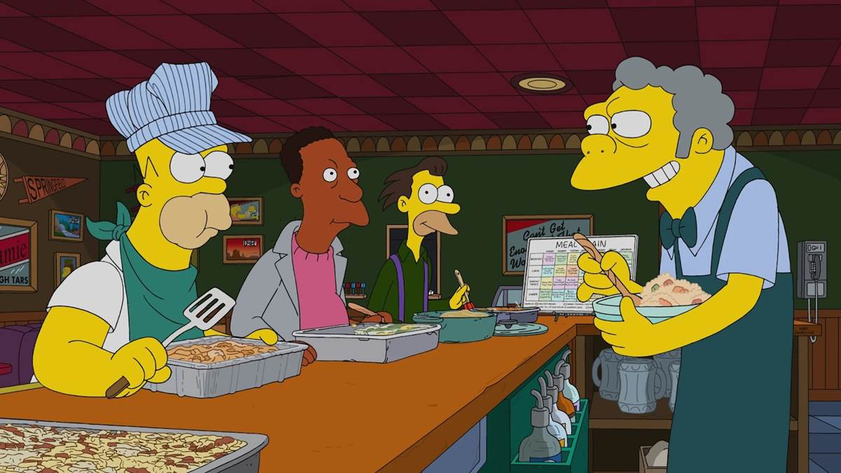 “Carl Carlson Rides Again" begins with Homer Simpson (Dan Castellaneta) discovering something called a “Meal Train"-- it seems Ned Flanders injured himself helping Homer get a free hat off his roof, so Marge (Julie Kavner) and the other neighborhood women offer to bake him home-cooked meals until his broken arm is healed. Homer sees this as an opportunity for him and his barfly friends to fake injuries and collect a steady stream of complimentary meals at Moe’s (Hank Azaria) Tavern. The only problem with this plan, as Carl points out, is that after consuming so much food the guys are no longer even in bowling shape, and the season is coming up. So Carl uses a bowling exercise video to slim down, to the point where he even needs a belt– and he dons the shiny gold belt buckle depicting a bull-riding cowboy that was the only thing left for him by his birth parents. At the bowling alley, the newly svelte Carl meets a woman named Naima (Dawnn Lewis) who is disgusted with the concept of wearing gross borrowed shoes. They’re taken with each other as Carl extolls the joys of bowling, or as he hilariously describes it, “America's slowest-dying indoor sport." They agree to a date that weekend at the soul-food restaurant that she owns on “their side of town," which Carl later privately confesses to his friends he’s never visited. Cue the montage of Homer and the guys taking Carl to Springfield’s black-owned barbershop and thrift store, where, respectively, he gets the “Denzel Washington" hairdo and sells his prized belt buckle for some seemingly hipper clothing.