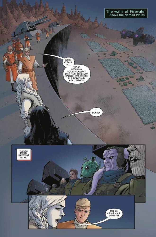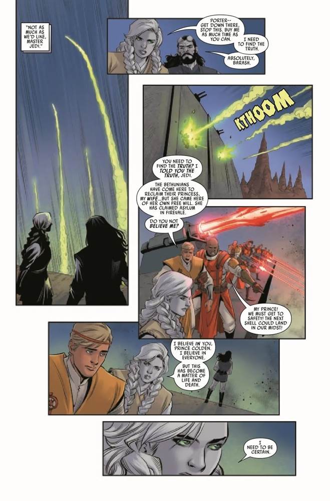 The High Republic - The Blade #3 begins with the two Jedi looking out over the mercenary army that the Bethunian side of the conflict has enlisted to attack the city of Firevale, whose prince claims that his wife– the heir to Bethune– has come there on her own volition. In order to stall the assault so Barash can investigate further, Porter descends to the ground below and talks with the invaders– after skillfully deflecting their blaster bolts, of course, once again earning his titular nickname, the Blade of Bardotta. Meanwhile, Barash meets with Firevale’s royal family and its new member, determining that the star-crossed couple had fled Bethune fearing danger to both themselves and their unborn child. We then get a flashback to 15 years earlier in the Jedi Temple on Coruscant, with writer Charles Soule filling us in on how exactly Silvain and Engle came to think of each other as brother and sister, despite being two completely different species from other worlds. This interlude gives a little more context to the proceedings on Gansevor, where Barash decides that this particular war is indeed no longer worth fighting.