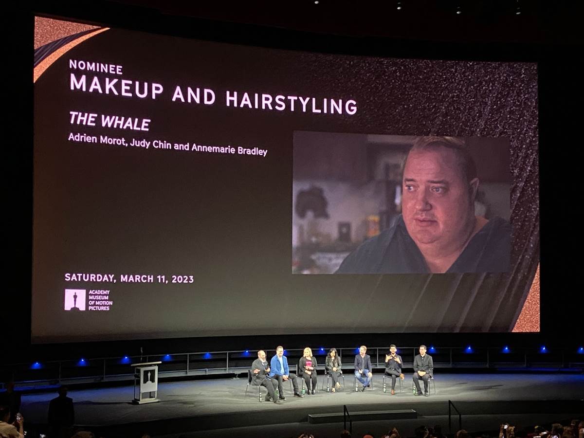 The final discussion of the day was for Darren Aronofky’s The Whale, for which nominees Adrien Morot, Judy Chin, and Annemarie Bradley took the stage, followed by actor Brendan Fraser himself, who stars as Charlie. They talked about the ambition to shoot a small movie in five weeks during the pandemic, and how Charlie was created from the outside in. “His body had to obey the laws of physics and gravity," said Fraser. “It gave me a strong sense of ownership, in being able to speak the voice of those who don’t often have a voice. In the film he wore heavy, full-body, head-to-toe prosthetic makeup, and the team wanted to ensure that the audience would believe that Charlie’s skin was real. They kept the other characters’ makeup quite bare so that Charlie would be believable in comparison. “She Frankensteined me, and I liked it," joked Fraser, whose hair was removed so the hairstylists could add wig pieces. Aronofsky was quoted as insisting that “at no point can you interfere with Brendan’s main tool, which is his ability to act with his face."