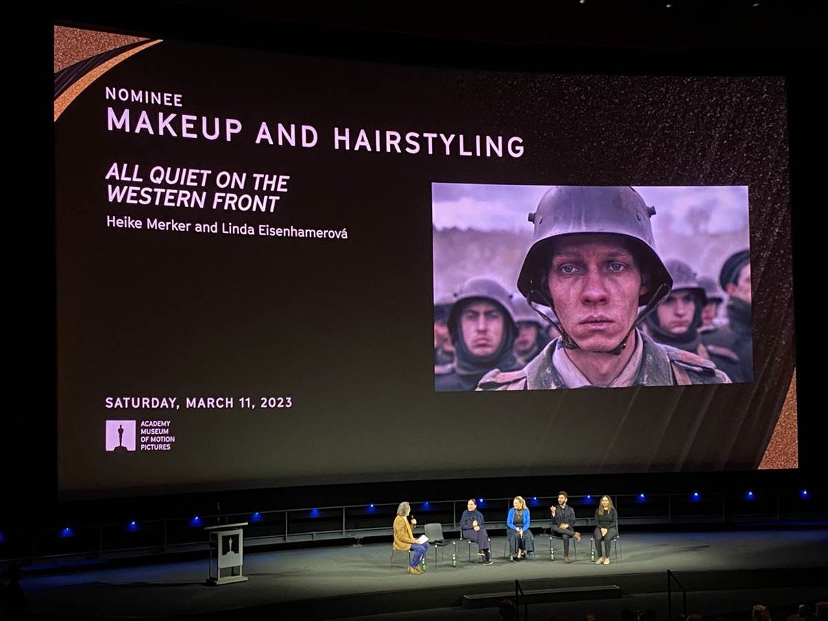Representing All Quiet On the Western Front were Heike Merker and Linda Eisenhamerová, who talked about how all the departments working on the film were literally “in the trenches" together, living through what the characters were going through for long days. They had two hours of prep work each morning, ten-hour shoots, plus cleanup and COVID protocols to deal with. “We just had to keep going," said the makeup team. They commended the actors for allowing them to make them look dirty and gross, embracing their work even though they were shooting out of continuity– spending four to six weeks in the World War I trenches then moving on to the beginning of the film.