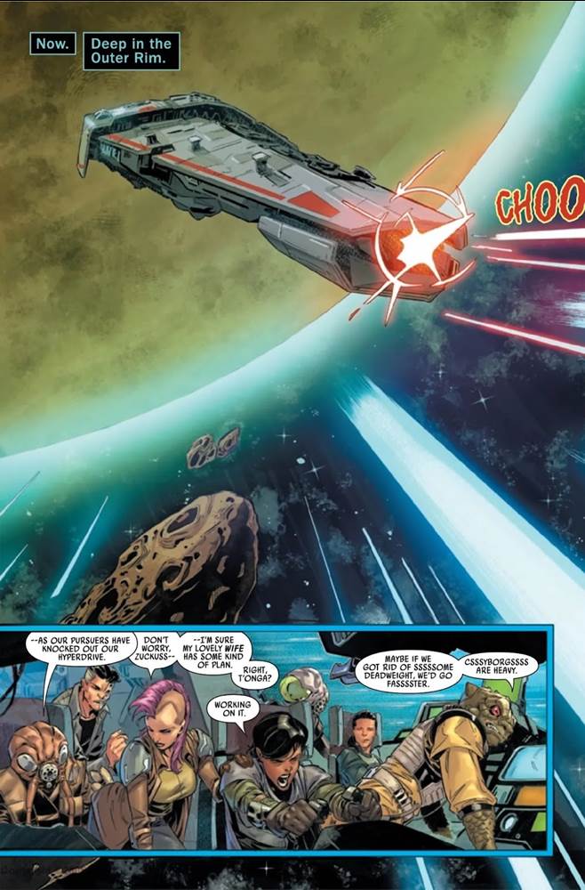 Then writer Ethan Sacks cuts to the “present" of this comic (the period set between the events of Empire and Return of the Jedi), where the bounty-hunter crew of the Edgehawk is being pursued by the Galactic Empire’s deadly Inferno Squad and its Commander Iden Versio (both originally from the Star Wars: Battlefront II video game). In order to shake this elite unit, the Edgehawk enters into the Lost Souls Asteroid Field, where it can only hope to hide until it hopefully emerges from the other side without having been destroyed. Meanwhile, a mysterious Force wave emitted by the ancient device known as the Fermata Cage– an event that apparently happens in the upcoming finale of the Star Wars: Hidden Empire miniseries, though it’s a bit confusing that these were released out of order– causes the Force-sensitive Gand findsman Zuckuss to go into a self-imposed trance, temporarily reentering his own memories about the above-mentioned Great Rite. This is unfortunate for the other bounty hunters who need Zuckuss to navigate through the asteroid field, but fortunate for us as readers who are treated to the Gand’s origin story for the first time.