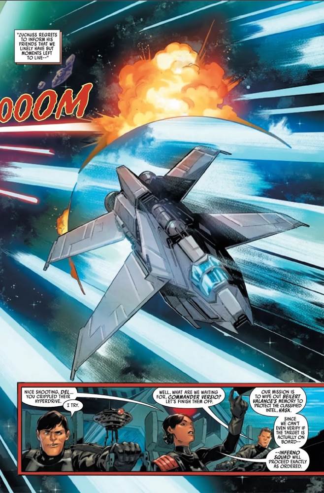 In the Great Rite, Zuckuss must compete against other Gand young to retrieve the rare T’karra flower and go up against a creature called the Charon (borrowed from the late-80s Star Wars roleplaying game). Zuckuss succeeds in defeating the menacing Charon, but having abandoned the T’karra during the slaughterous confrontation he is exiled by his clan and vows to “find his own way" in the galaxy. Back in the present, Zuckuss’s faithful droid sidekick 4-LOM manages to awaken the Gand by replicating the sound of the ancient incantation that concluded his flashback, and with his help the crew is able to evade the last of the asteroids. But Iden Versio’s Inferno Squad is still out there searching for our antiheroes, and if the cover of next month’s issue is any indication they’ll be heavily featured in upcoming chapters of this story. In the meantime, I thought Bounty Hunters #32 was an excellent issue, considering it featured the Zuckuss origin tale I never knew I needed. Sacks skillfully balanced the ongoing threat in the present with the effort of tying it into events from Zuckuss’s past, and guest artist Alessandro Miracolo did a pretty solid job of mimicking the style and tone of regular contributor Paolo Villanelli. Overall I’ve really been digging this period of Bounty Hunters (after the fate of Cadeliah was left to Lady Qi’ra and Crimson Dawn), and I’m definitely looking forward to more.