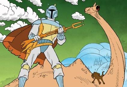 Some may recall that in the infamous Star Wars Holiday Special from 1978, Boba Fett (making his first appearance in any Star Wars media) rode a dinosaur-like beast, and though it was later identified as a Paar's ichthyodont, some fans have theorized that this creature served as an early version of– or inspiration for– the Mythosaur.