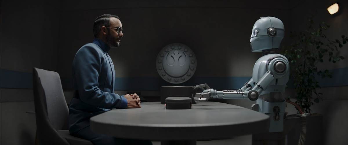 But Bo-Katan opts to keep this information from Din, who is cool with taking off now that he’s been “redeemed" by bathing in the underground lake. But on the way back to Kalevala, they’re ambushed by a squadron of Imperial TIE interceptors, who chase them down to the planet’s surface, where a big dogfight sequence ensues. This ends with our two Mandalorian protagonists (along with Grogu and the trusty droid R5-D4) escaping unscathed, but with Bo-Katan’s castle having been leveled by TIE bombers. Then we cut to Coruscant, where the above-mentioned Dr. Penn Pershing is giving a speech about how thankful he is to have been accepted into the New Republic’s Amnesty program for ex-Imperials– think of this as sort of like the Star Wars version of the real-life Operation Paperclip (speaking of ties to The X-Files), but slightly less insidious– for now, anyway. At first Pershing seems content with his new life and genuinely thankful to have been given a second chance, but he soon finds himself under the influence of Elia Kane (Katy M. O’Brian from Ant-Man and the Wasp: Quantumania), a former officer on Moff Gideon’s light cruiser– first seen in several episodes of The Mandalorian’s second season. Pershing, Kane, and their fellow Amnesty project participants are given numbers by the New Republic to go by in their housing sector and drone-like office space– shades of Syril Karn’s humdrum life in Star Wars: Andor– the first sign that this freshly installed galactic government may be making the mistake of being just a tamer version of the previous one.