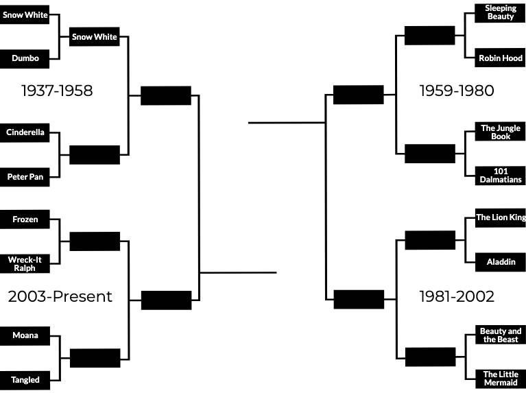Before we move on to our next matchup, let’s take a look at our last result. The top-seeded film in the ‘37-’59 region took it home and it wasn’t close. With nearly 82% of the vote, Snow White and the Seven Dwarfs will unsurprisingly be moving on to the second round.