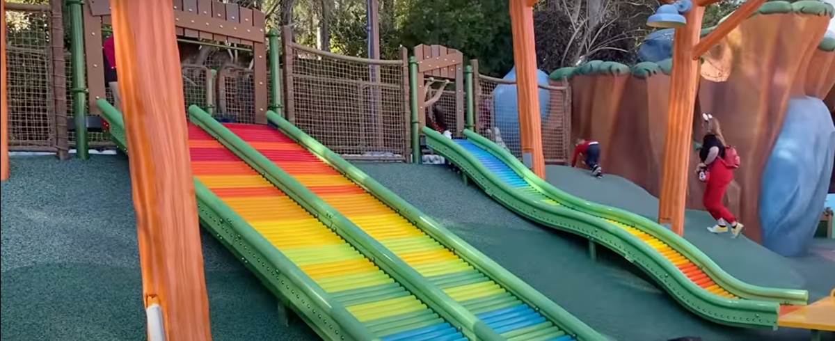 The original 1993 attractions, Goofy’s Bounce House, Donald’s Boat, Chip ‘N’ Dale’s treehouse, all had seen numerous changes or closures as time progressed. Most, largely influenced by Disney’s stringent legal team. While the newer play areas also feature slides (all removed by Toontown’s 2022 closure) these are made of rollers, and one can’t help but wonder how long it will be before those are removed. The same can be said for those fake tree roots surrounding the centerpiece new tree. Adding to the green space that overpopulates the new land.