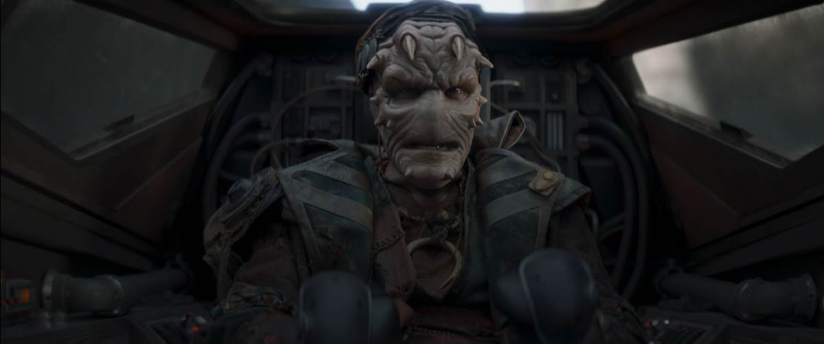 Most of the remainder of the episode is a very fun action sequence that sees the Mandalorians dropping into Nevarro City for a ground assault while Din Djarin (Pedro Pascal) distracts Gorian Shard’s airforce with the N-1 starfighter. There’s some welcome comic relief in the form of the Anzellan droidsmiths (Shirley Henderson) and once again I can’t help but want all of Shard’s very neat-looking crewmembers in action figure form as soon as possible. This episode’s director was Spider-Man: Into the Spider-Verse helmer Peter Ramsey, who I don’t believe has worked in live-action before, so it makes sense that the sequences that work best are the most heavily choreographed one that would have largely been assembled in pre-visualization, rather than the dialogue-heavy ones that come across as somewhat stilted and hamfisted here. It’s a thrill to see our heroes take back the city streets of Nevarro by force, but the most interesting parts of “The Pirate," story-wise, come in the episode’s denouement. It seems our covert has found a new, at least relatively giant monster-free home for the time being, back where they started in The Mandalorian’s first season, and also Bo-Katan Kryze (Katee Sackhoff) has been given the go-ahead to remove her helmet by the Armorer (Emily Swallow) not to mention the task of reuniting all the various scattered Mandos out there in the galaxy in an effort to reclaim Mandalore.